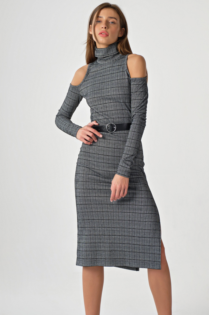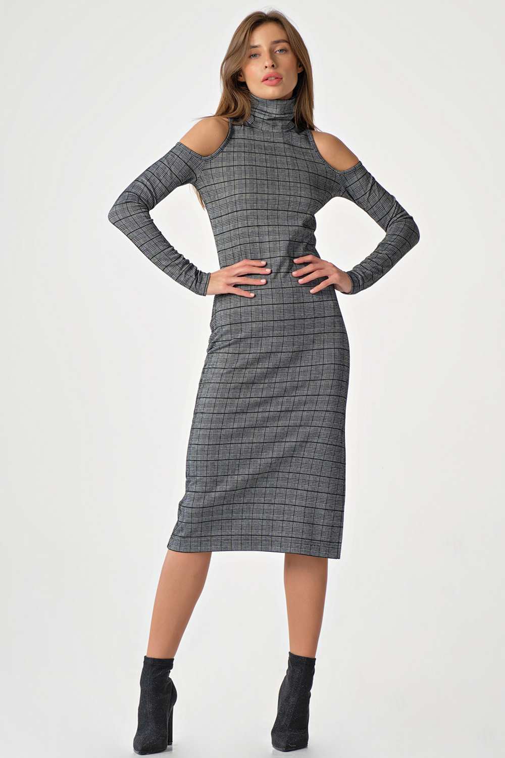 ст. цена2079руб.! Платье трикотажное с открытыми плечами и рукавами в клетку черно-белое
