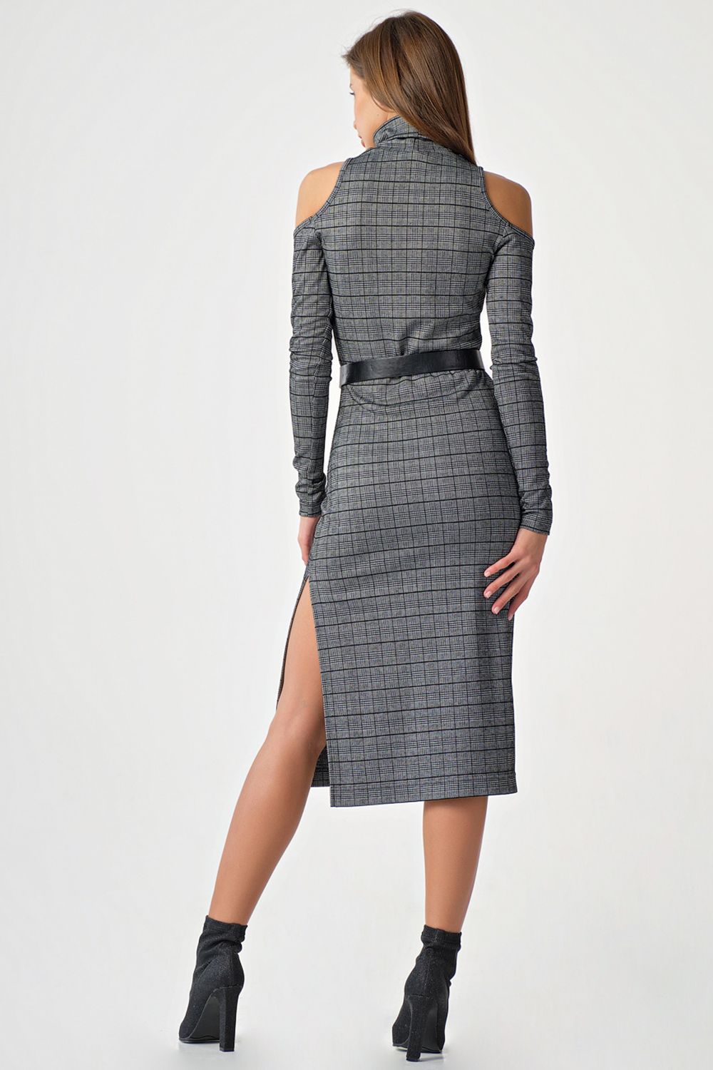 • Особенности: Платье полуприлегающего силуэта из трикотажа. Детали: воротник-стойка, открытые плечи. Без застежки.