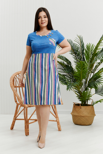 Платье женское прямого силуэта, слегка расширенное к низу. Рукав цельнокроенный короткий. Кокетка полочки, карманы и широкая рюша по низу изделия из отделочной ткани в мелкий горошек. В верхней части платья небольшая сборка для комфортной свободы по груди изделия. На средней части кокетки и карманов по одной декоративной пуговице. По горловине изделия, входу в карман и низу рукава двойная окантовка с белым кантом.