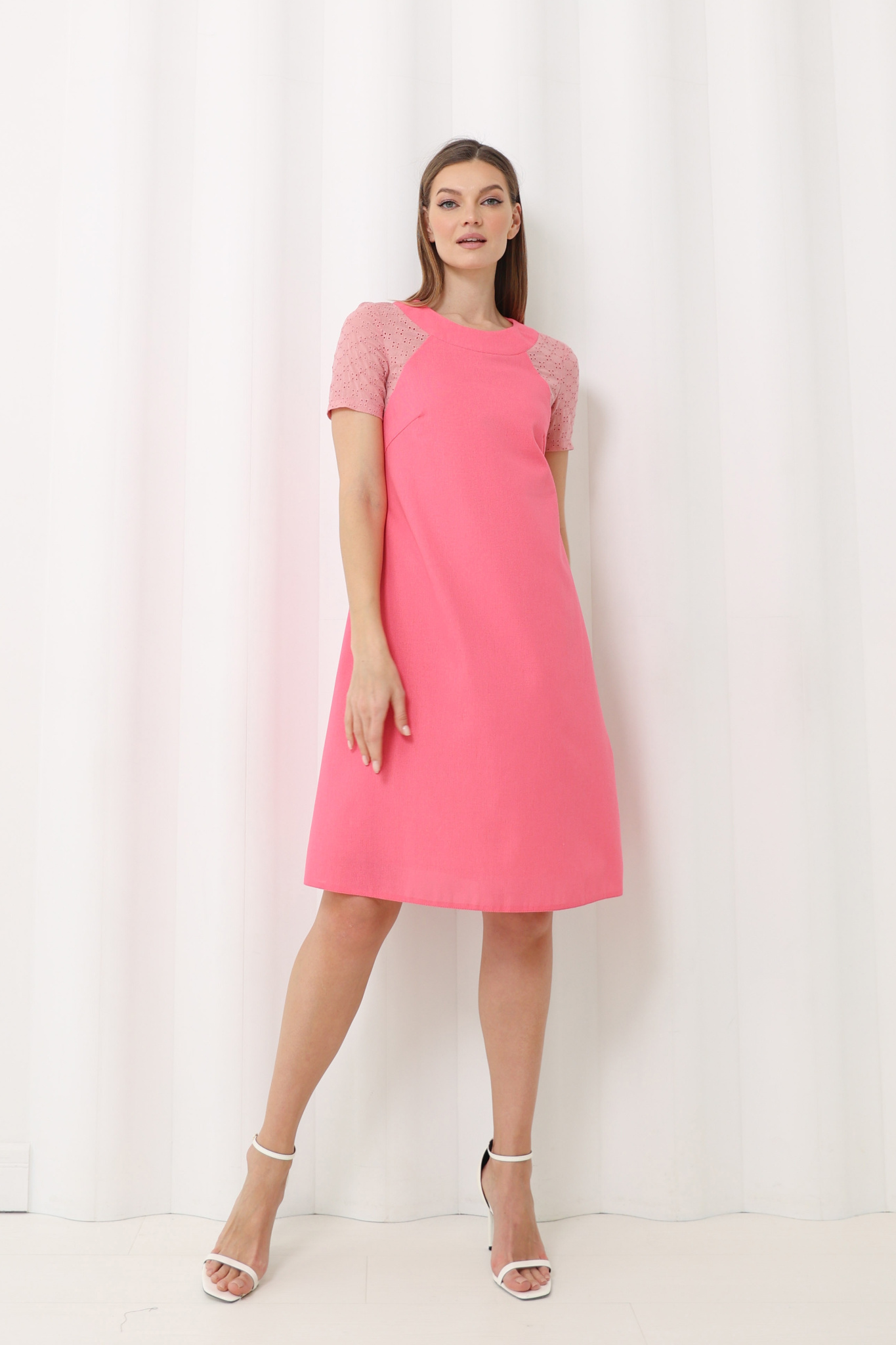 Платье А-силуэта из смесового льна. Круглая горловина. Рукав реглан из шитья. Застёжка на пуговицы.
