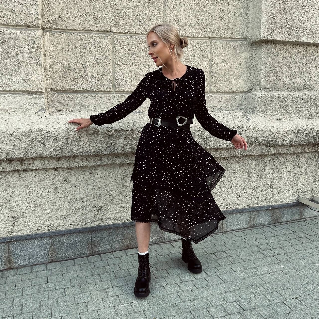 Рената Литвинова, принцесс Диана и Моника Белуччи. Это неполный список звезд, которые обожают платья в мелкий горошек. Предлагаем дополнить этот список вашим именем. Платье в длине миди. Ткань слегка просвечивает. Убка в 2 слоя, подол ассиметричный, оформлен ярусами. Тонкие завязки в зоне декольте.