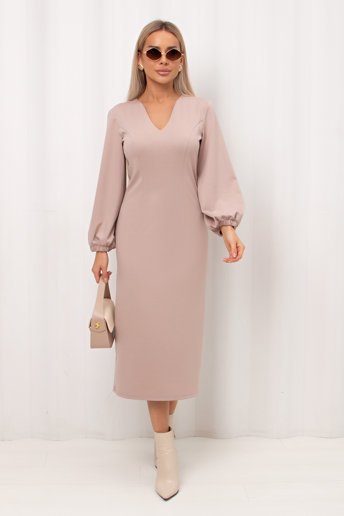 Женственное платье полуприлегающего силуэта изготовлено из трикотажного полотна. V-горловина на внутренней обтачке.  Втачной рукав длиной 7/8 по низу присобран на резинку. По среднему шву спинки застежка на потайную молнию. Низ ровный, сзади разрез.