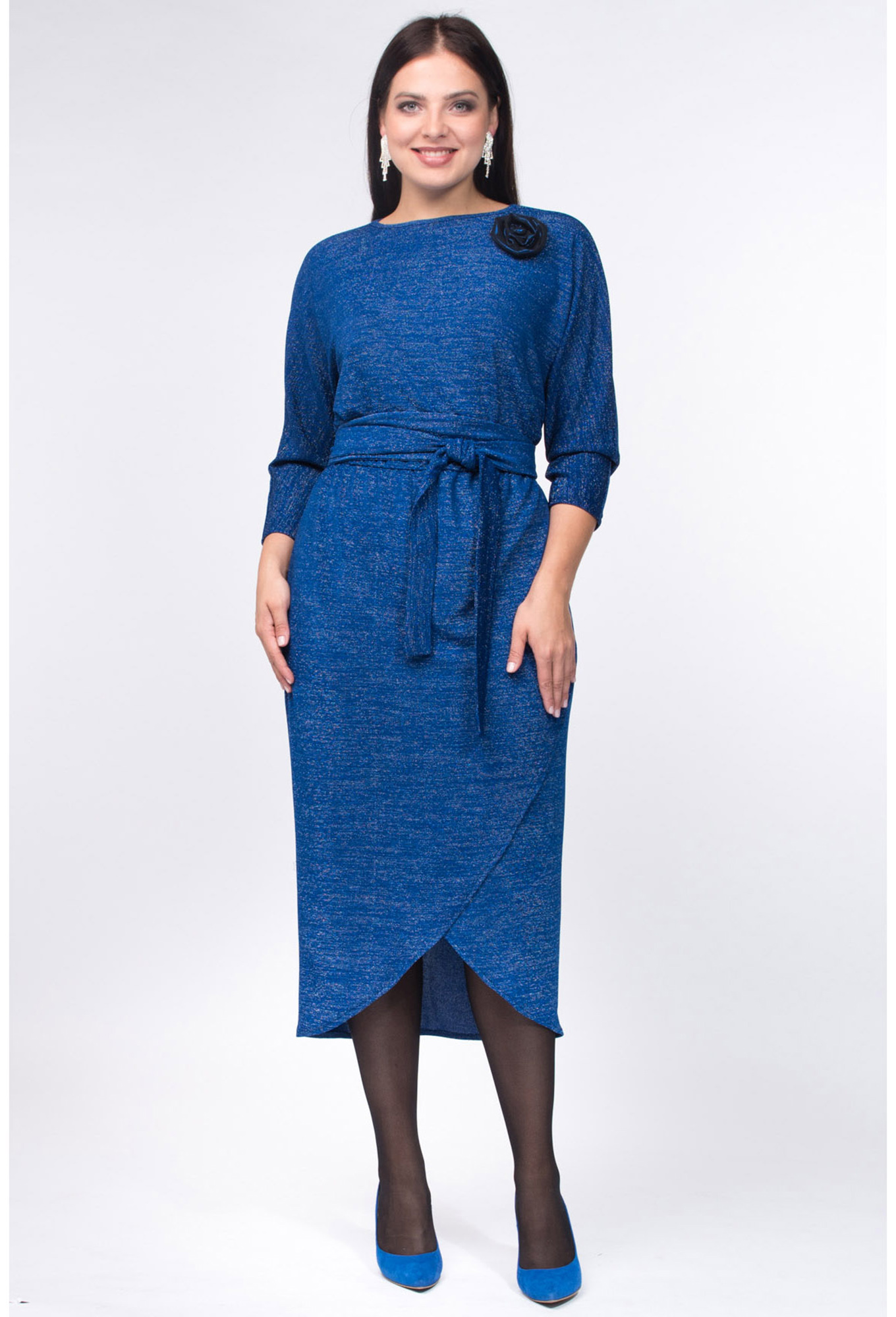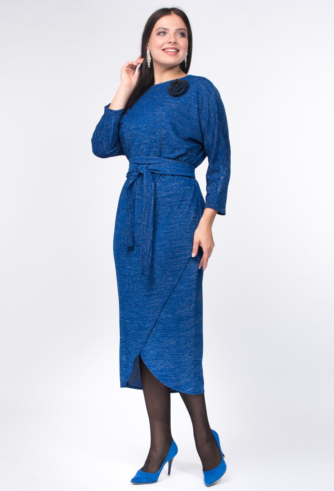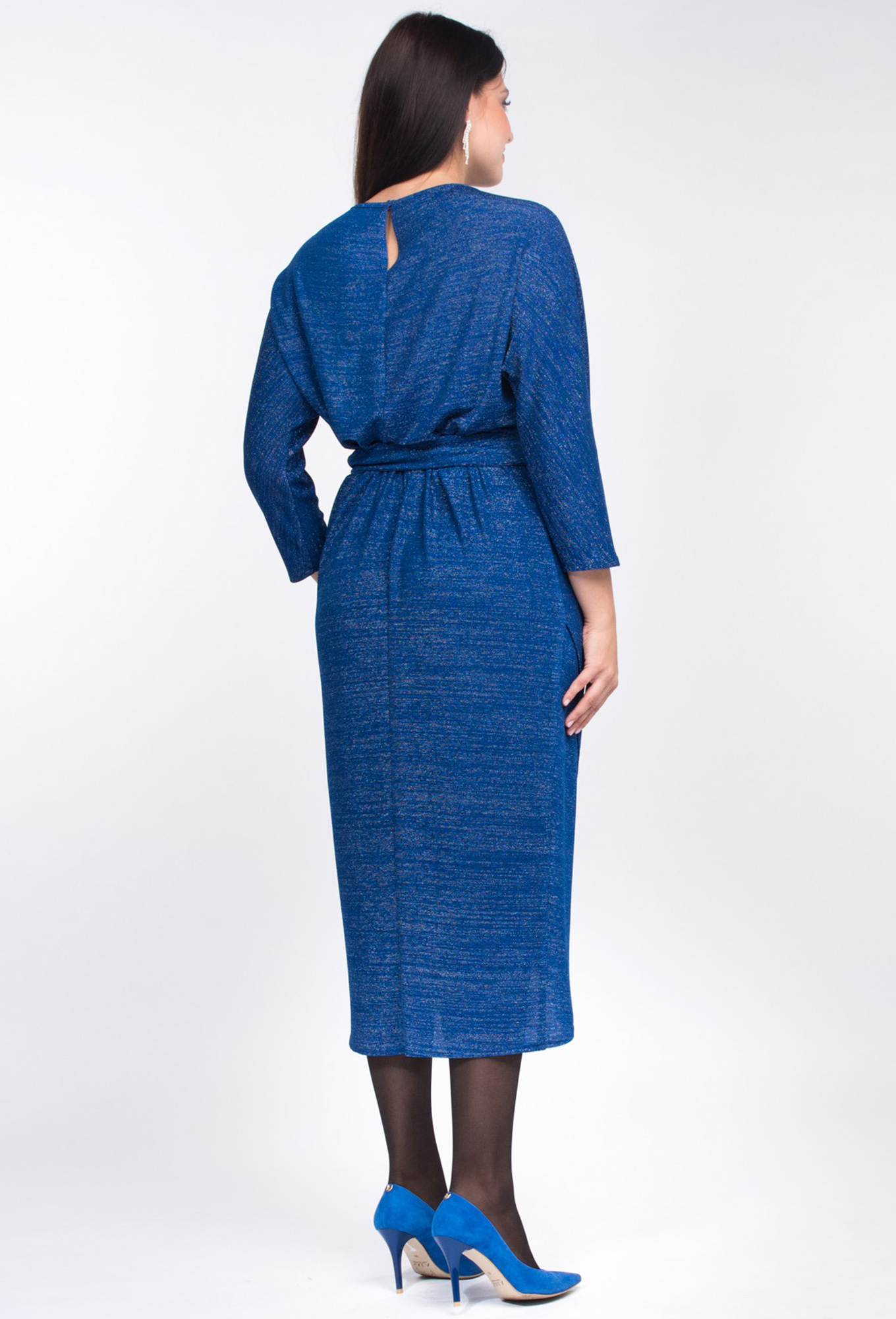 Модель: Амелия Люкс 34-47 синий Р..показатьост: 164 см (девушка на фото ростом 170 см) Сезон: круглогодичный Тип ткани: 67% вискоза, 25% полиэстер, 5% люрекс, 3% эластанНарядное платье из приятного тонкого трикотажа с мерцающей люрексовой нитью .Платье отрезное по талии, по талии вставлена узкая резинка для комфортной посадки, нижняя часть платья с запахом с фигурно закругленными полочками. Вырез лодочка, застегивается сзади на 1 пуговицу . В комплект входит пояс -кушак из основной ткани.