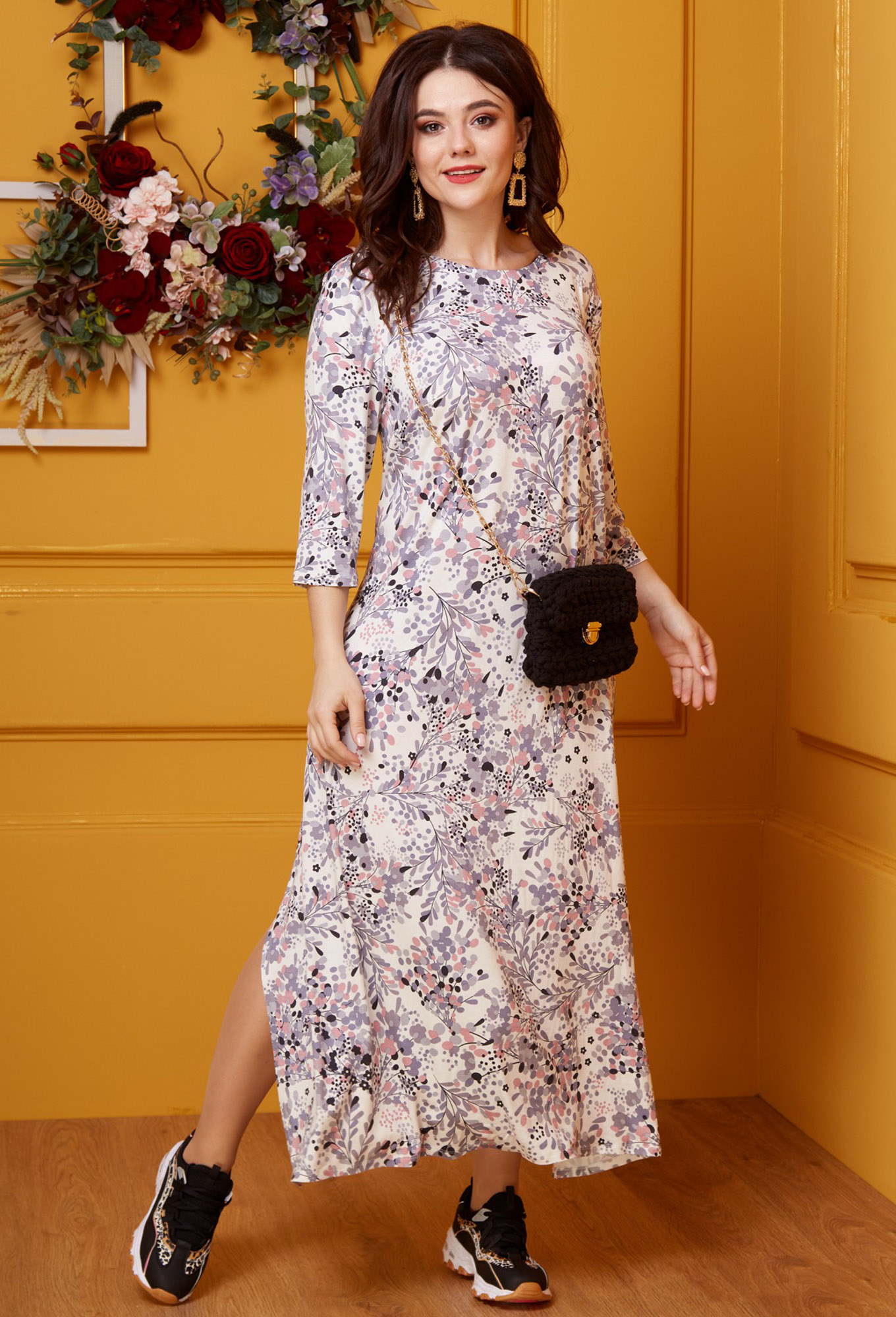 Модель: Анастасия 398 серый Рост:..показать 164 см (рост модели на фото 170см) Сезон: круглогодичный Тип ткани: Полиэстер-95%, спандекс-5%Платье женское из трикотажного полотна: на молочной основе цветы и листья. Платье длинное расширенное к низу. По переду нагрудные выточки с бокового шва. По боковым швам разрезы длинные. Горловина овальной формы обработана широкой обтачкой. По горловине прострочена отделочная строчка на 4 см. Рукав втачной одношовный 3/4 длины.