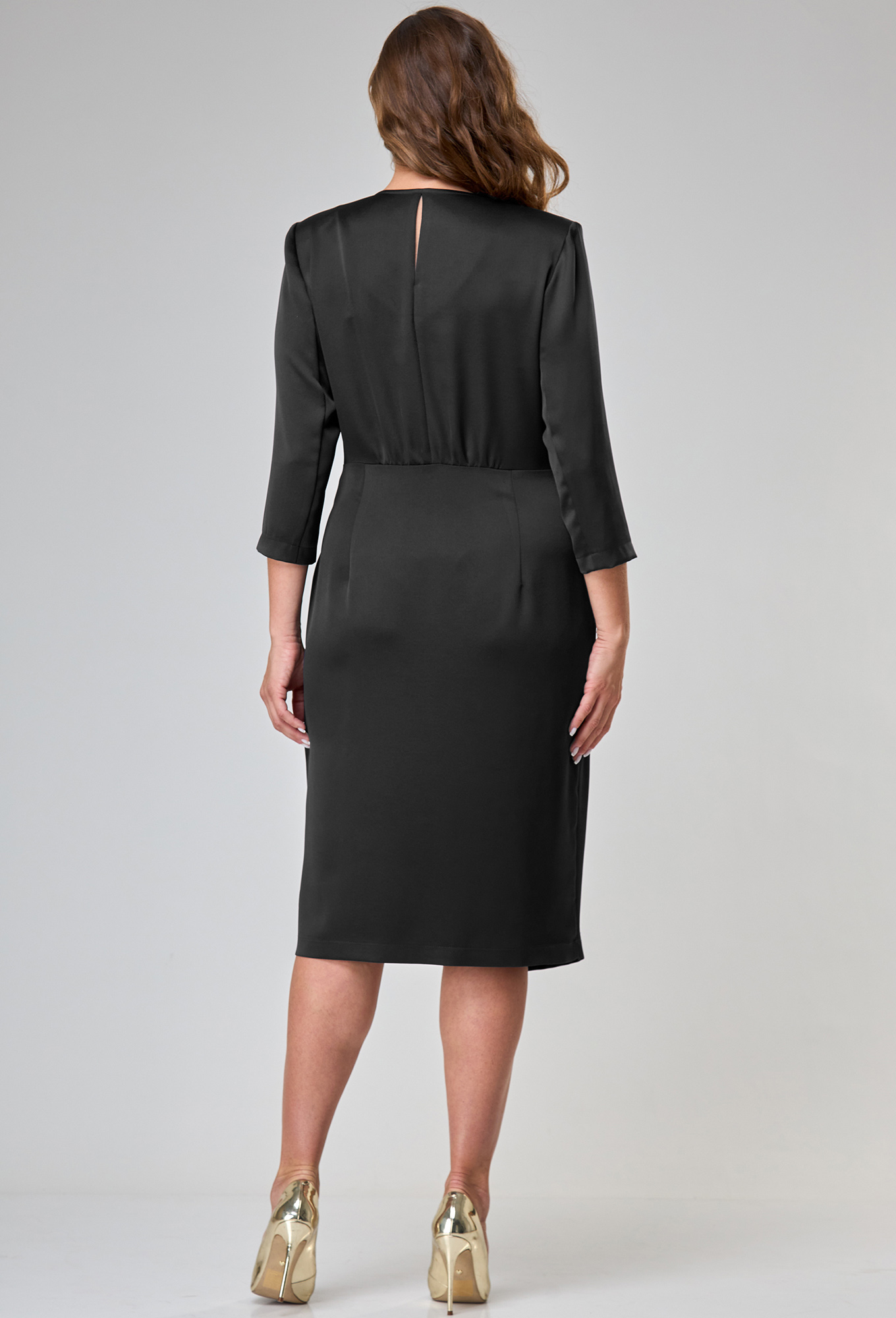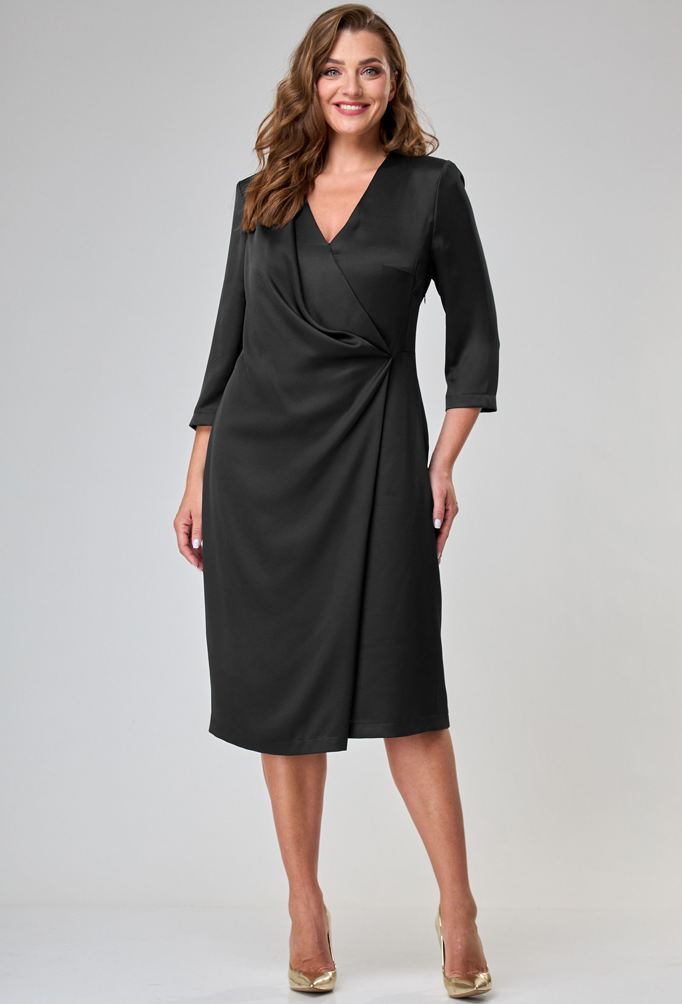 Верхняя часть с запахом и V-образной формой горловины. Отлетная часть полочки с правой стороны с драпировкой. В правом боковом шве обработан скрытый разрез. В левом боковом шве в области талии потайная молния. Спинка отрезная по линии талии, верхняя часть со средним швом, в верхней части которого обработан разрез. Верхняя часть спинки со сборкой по шву притачивания к нижней части. Нижняя часть юбки по спинке с талиевыми вытачками. Рукав втачной, двухшовный, длиной 3\4.