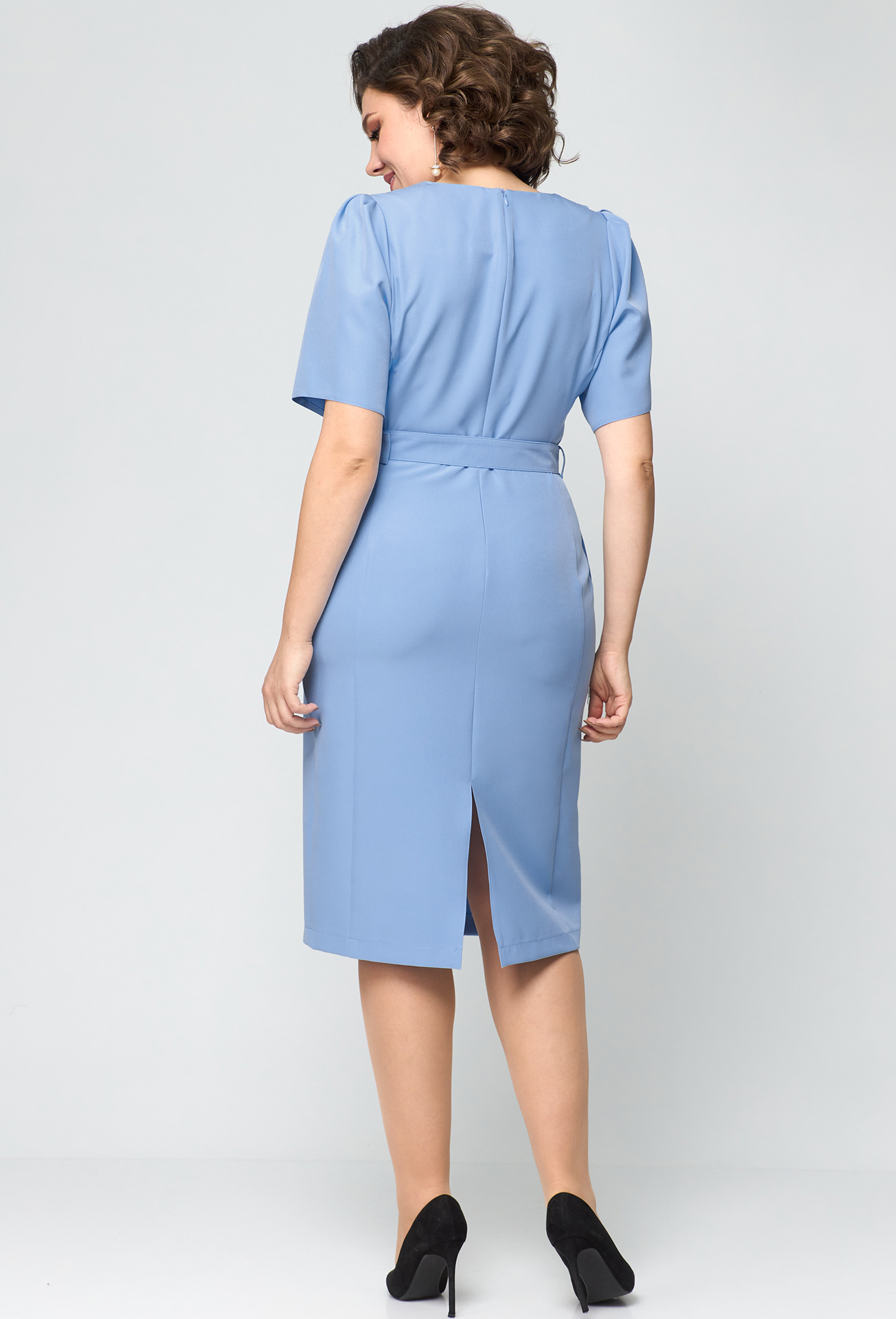 Модель: Анастасия Мак 1172 голубой ..показатьi>Рост: 164 см (девушка на фото ростом 170 см) Сезон: Круглогодичный Тип ткани: 100 ПЭ%Платье полуприлегающего силуэта, длиной за колено, выполнено из однотонной ткани. Передняя часть платья состоит из верхней и нижней части платья. Нижняя часть лифа полочки с вертикальными рельефами. Верхняя левая часть со складками, правая часть в виде детали-хвоста, закрепленного в плечевой срез и пройму. Низ хвоста с декором из тесьмы. Горловина V-образной формы. Нижняя часть переда с талиевыми вытачками. Спинка со средним швом и вертикальными рельефами. В верхней части среднего шва спинки обработана потайная молния, в нижней части разрез. По боковым швам в области талии настрочены шлевки, через которые продет пояс с пряжкой. Рукав длиной до локтя, втачной, одношовный. По окату рукава обработаны складки. Платье на плечиках.