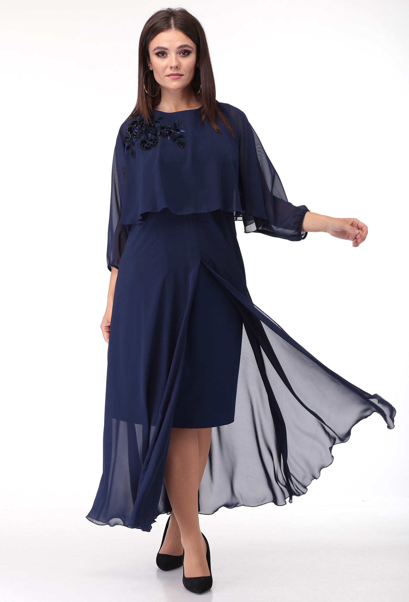 Модель: Анастасия Мак 673 темно-синий..показать Рост: 170 см (девушка на фото ростом 170см) Сезон: всесезонный Тип ткани: 77% ПЭ, 20% Вискоза, 3% Спандекс; 100% ПЭПлатье длиной чуть ниже колена, двухслойное. Платье выполнено из трикотажного однотонного полотна, однотонного шифона и элементов гипюра (вышивка на сетке). Верхняя часть платья двухслойная, лиф-основа с нагрудными вытачками, выходящими от шва притачивания к юбке. Отрезная фигурная асимметричная кокетка в верхней части полочки с наложением гипюра на трикотажное полотно. Рукав втачной, одношовный, слегка ниже линии локтя. Горловина круглой формы. Нижняя часть платья - юбка, притачная, двухслойная. Передняя часть юбки-основы с талиевыми вытачками, задняя часть юбки-основы также с талиевыми вытачками и средним швом, в нижней части которого обработан разрез. Верхняя часть юбки асимметричной формы, выполнена из шифона. Потайная молния обработана в левом боковом шве.