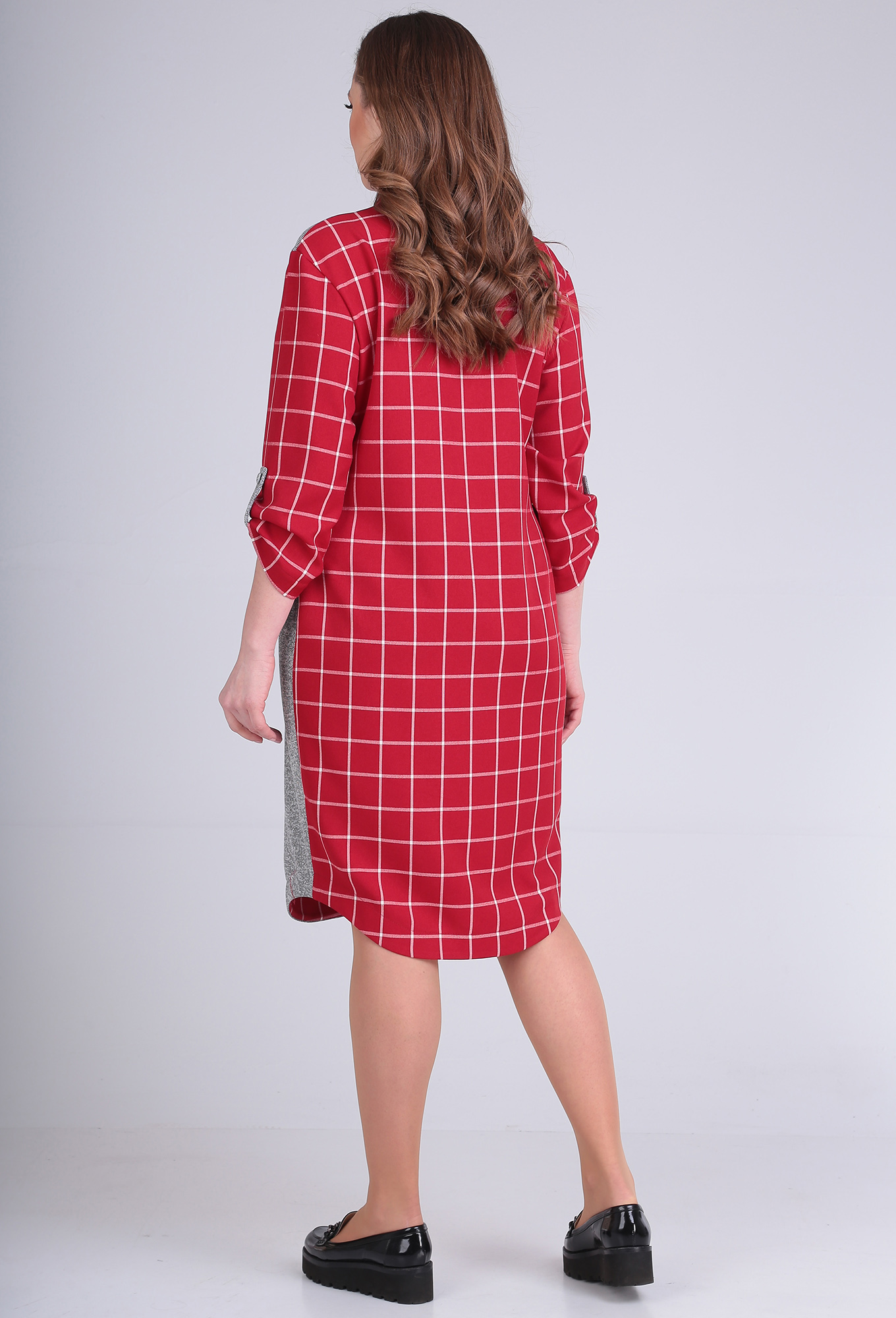 Модель: Анастасия Мак 688 красный ..показать>Рост: 170 см (девушка на фото ростом 170см) Сезон: всесезонный Тип ткани: 90% Полиэстер, 10% Вискоза.Платье выполнено из комбинации ткани в клетку и меланжевого трикотажного полотна. Платье прямого силуэта, длиной за колено. Полочка платья с центральной застежкой на десять пуговиц и петель, полочка с нагрудными вытачками, правая полочка выполнена из ткани в клетку, левая полочка из трикотажного полотна. На левой полочке в области груди настрочен карман с декором из гипюра в виде цветка. Воротник стояче-отложной, рубашечного типа. Спинка цельная, рукав рубашечного типа, длиной 7/8, втачной, одношовный. В нижней части рукава обработан хлястик, крепящийся пуговицей. Низ платья фигурный, прогнутый по боковым швам.