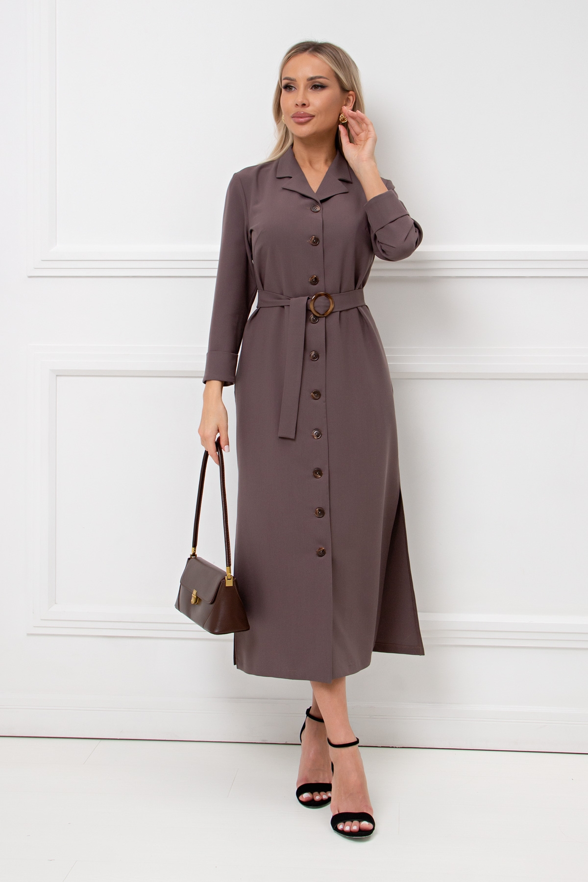 Лаконичное платье-рубашка прямого кроя выполнено из плательно-костюмной ткани.V-образная горловина оформлена отложным воротником. По переду застежка на петли и пуговицы. Рукав втачной, длиной 7/8. В боковых швах функциональные карманы. Низ ровный, по бокам разрезы. Пояс из основной ткани в комплекте.