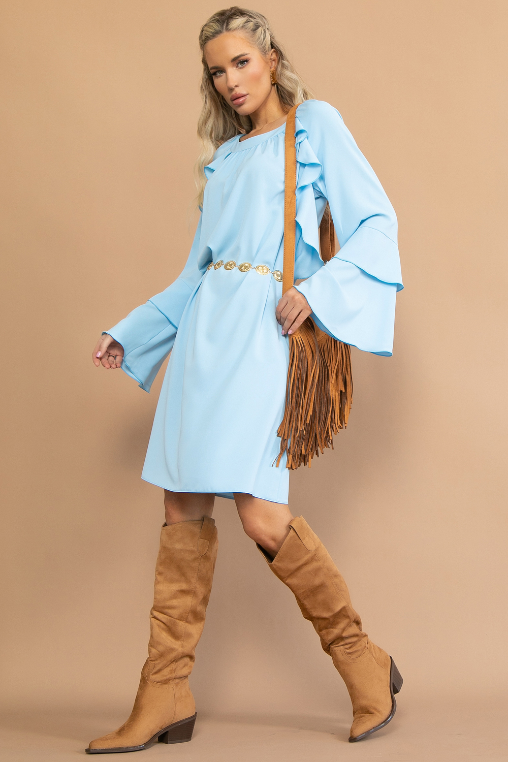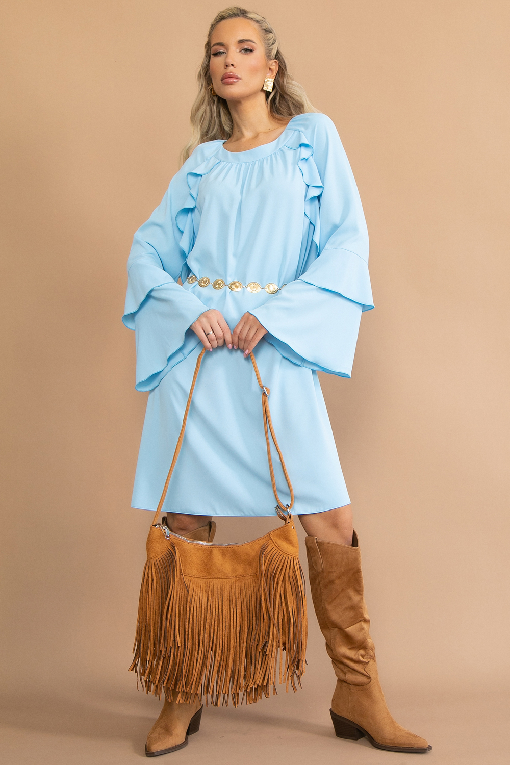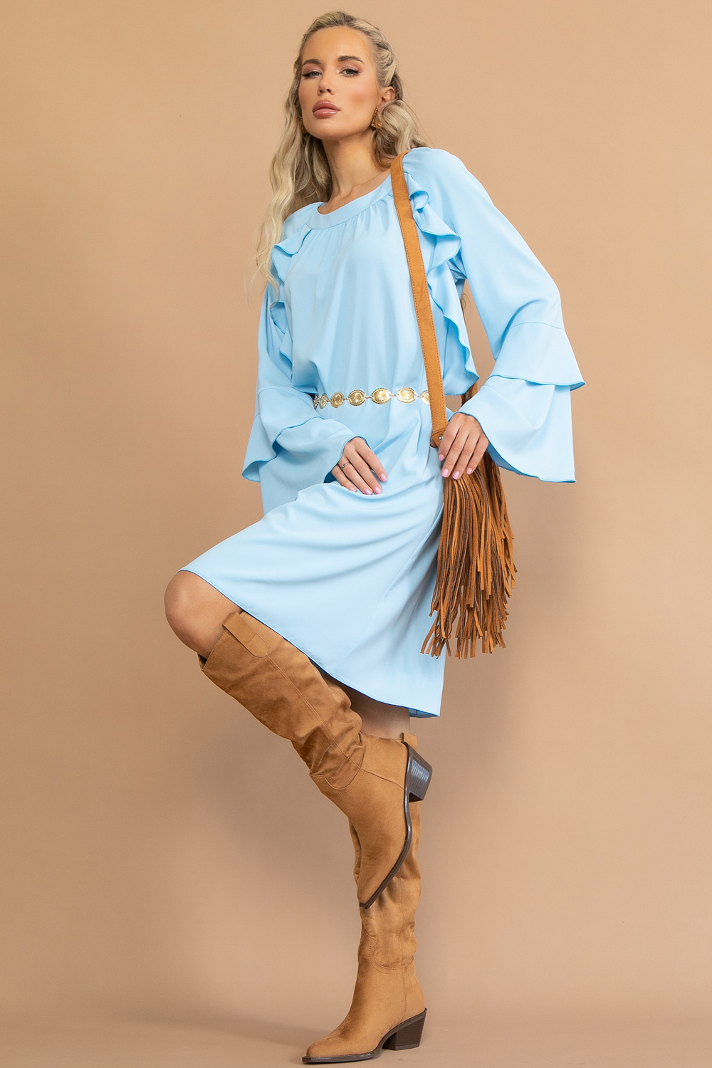 Романтичный образ в стиле “бохо” от бренда ELZA  – женственное шёлковое платье элегантной длины ниже колена. Рукава и декоративные рюши добавляют текстуры и игривости, делая ваш образ воздушным и романтичным.