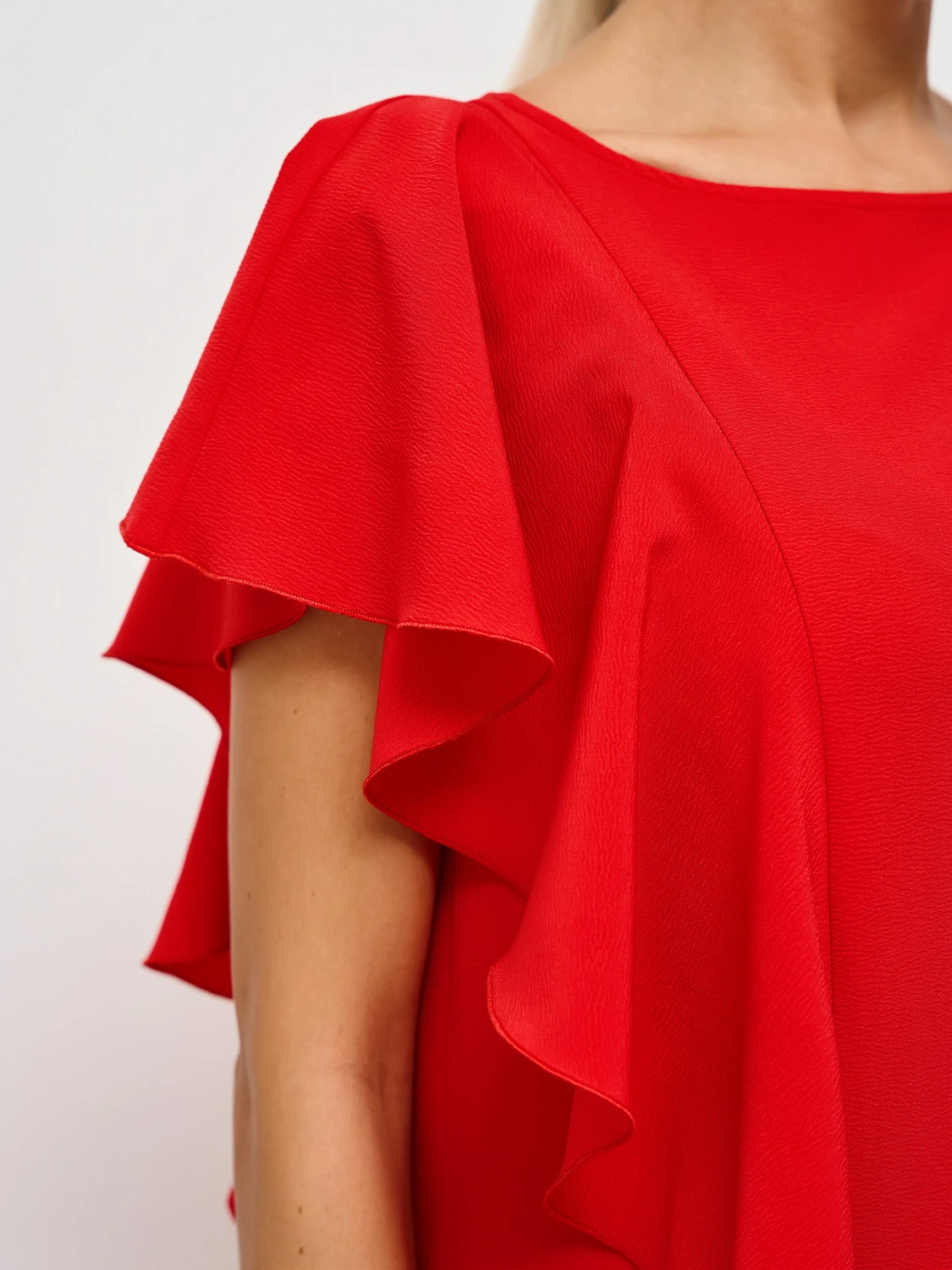 Перед  и спинка с одной стороны изделия декорированы пришивным воланом,  который  мягко ложится на плечо  и имитирует рукав.