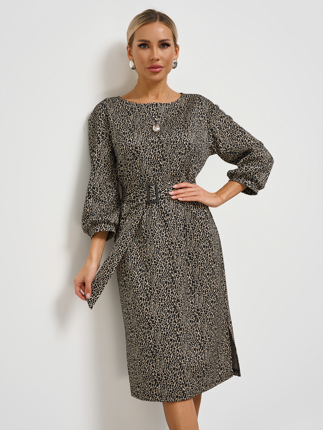 Платье свободного силуэта с круглым вырезом горловины.