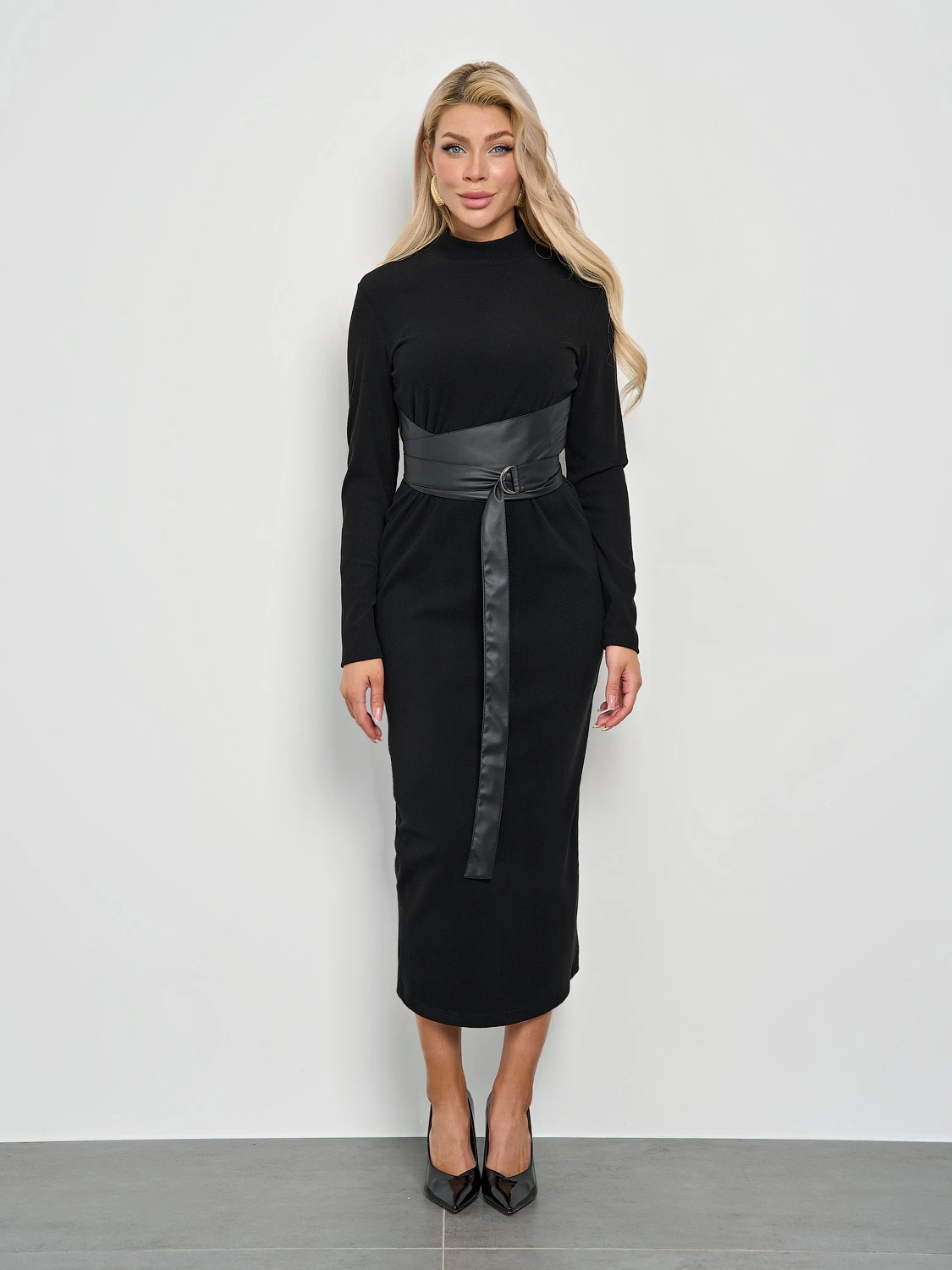 Пояс из искусственной кожи с пряжкой-полукольцом вшит в боковые швы изделия.