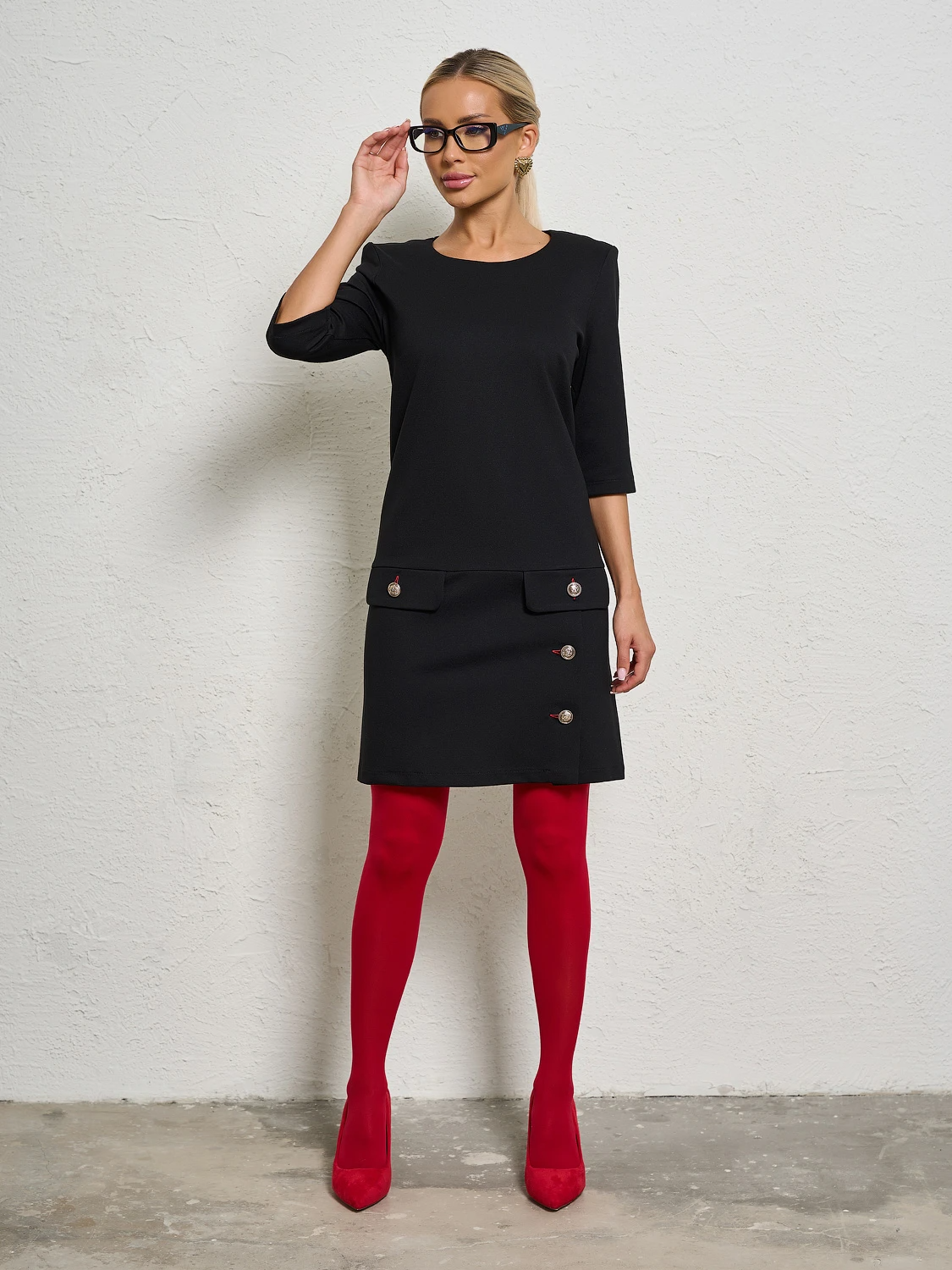 По нижней части платья расположены клапаны с декоративными пуговицами и разрез.