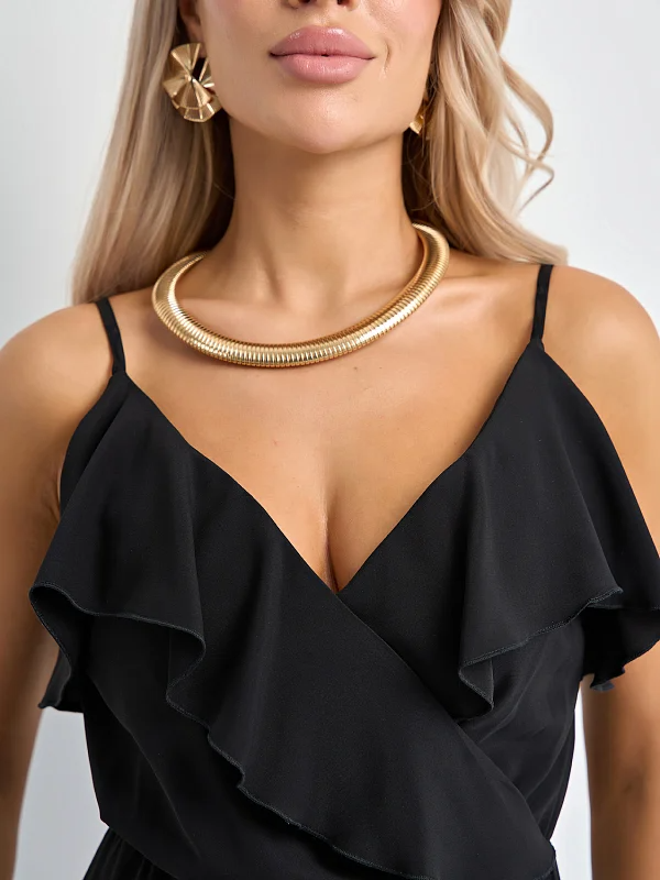 Верх выполнен в виде запаха с оборками по линии декольте, которые переходя на линию разреза по юбке.