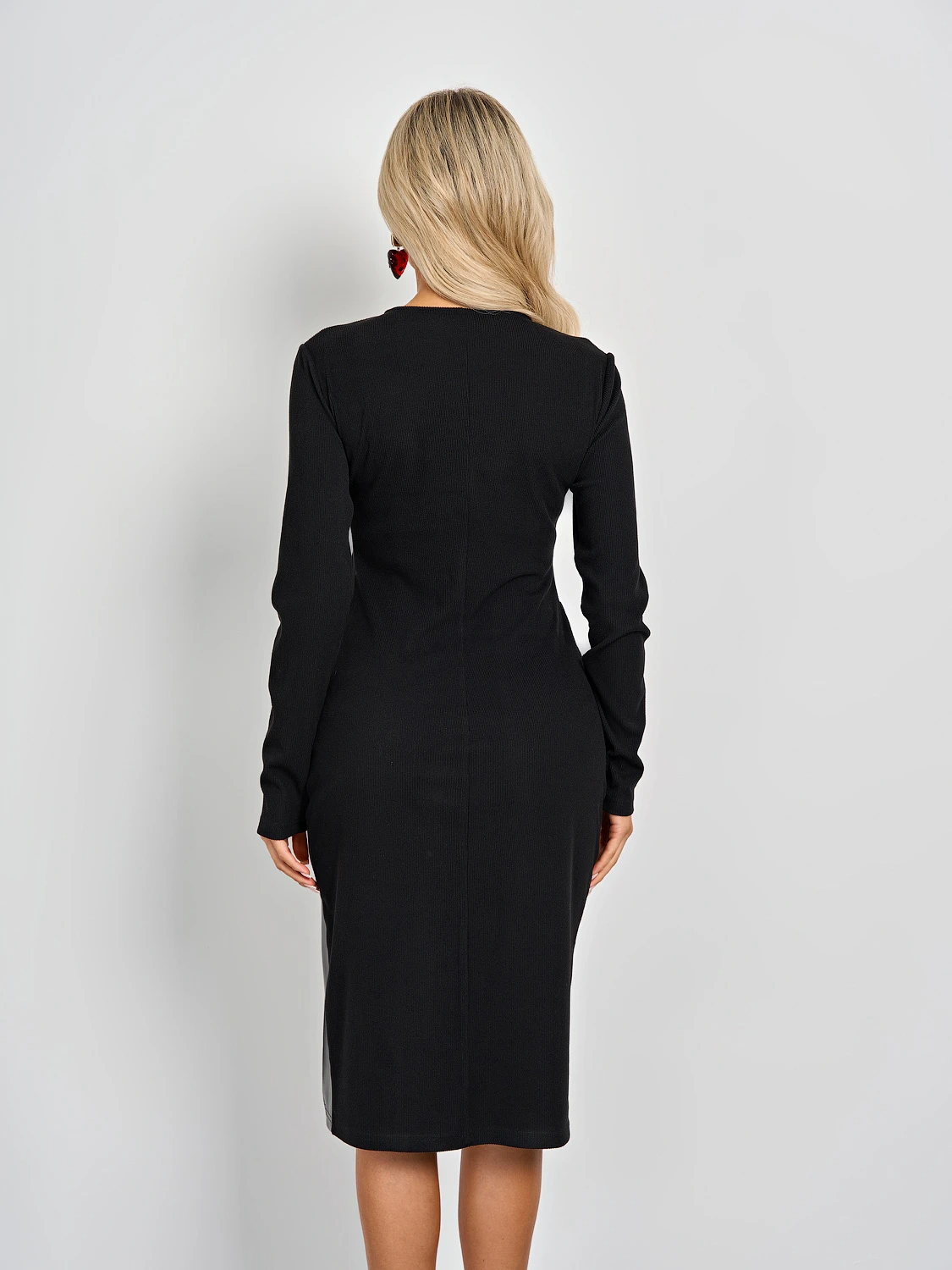 Талия и одна сторона платья декорированы вшивной лентой из искусственной кожи.