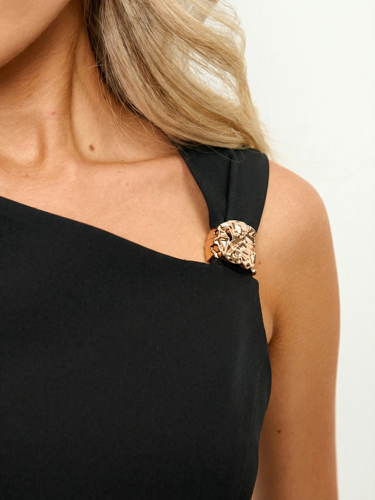 Вырез ассиметричен, дополнен металлическим кольцом-украшением.