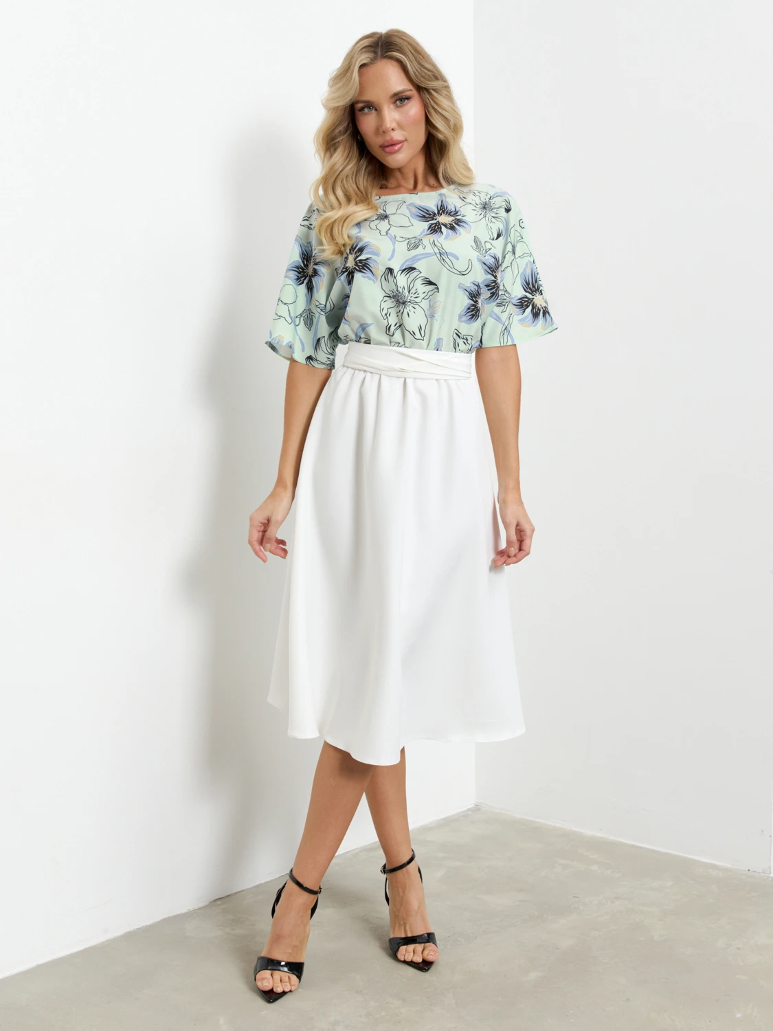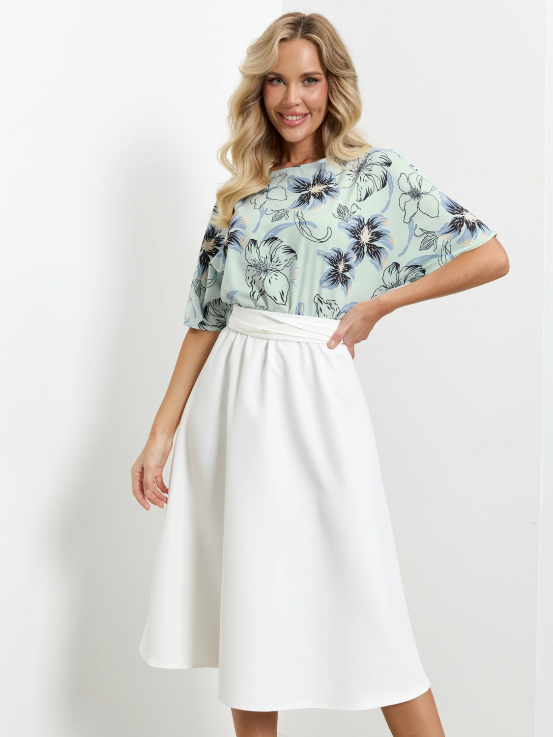 Верх выполнен из плательной ткани с принтом, низ и пояс из однотонной костюмной ткани.