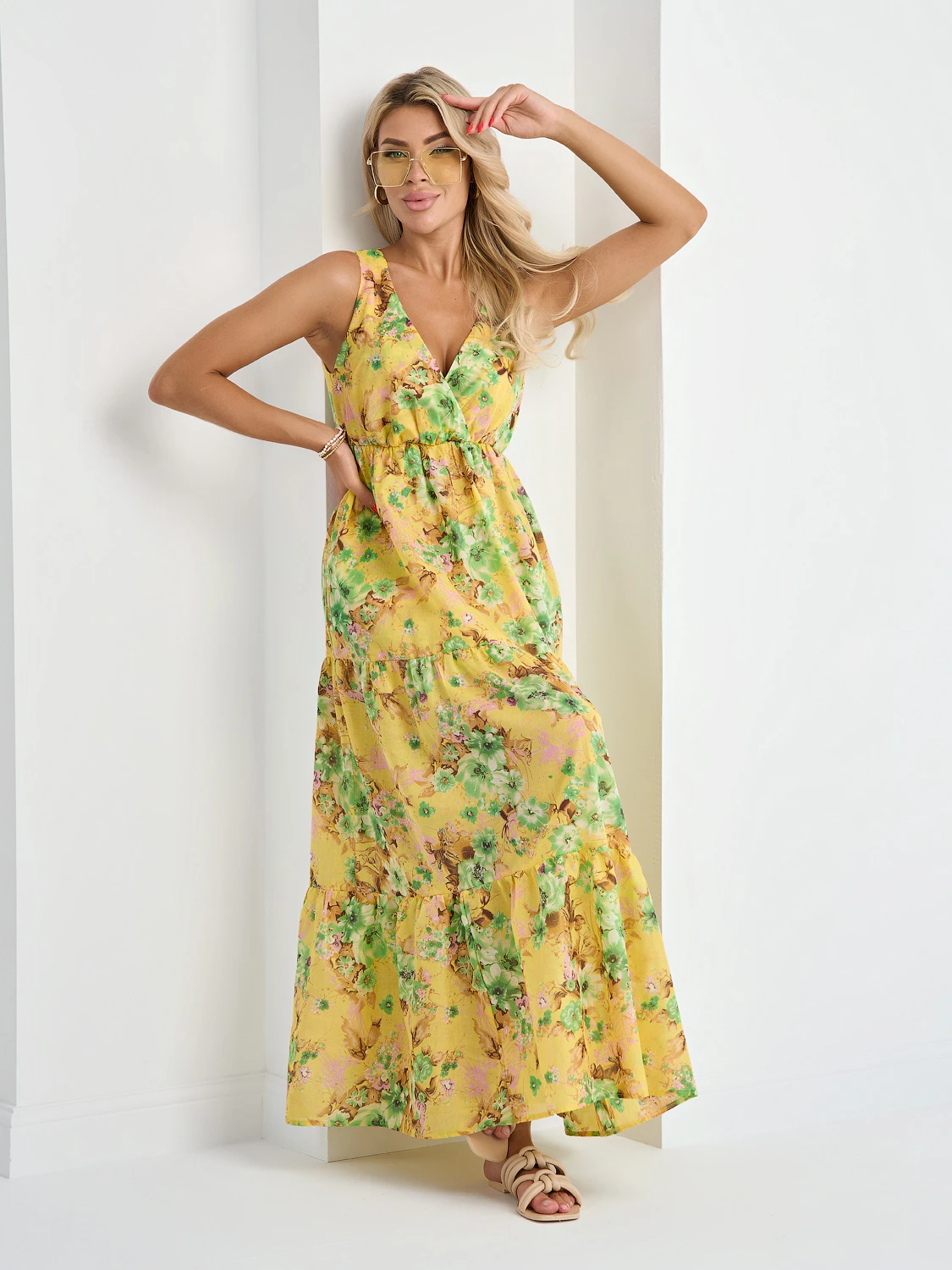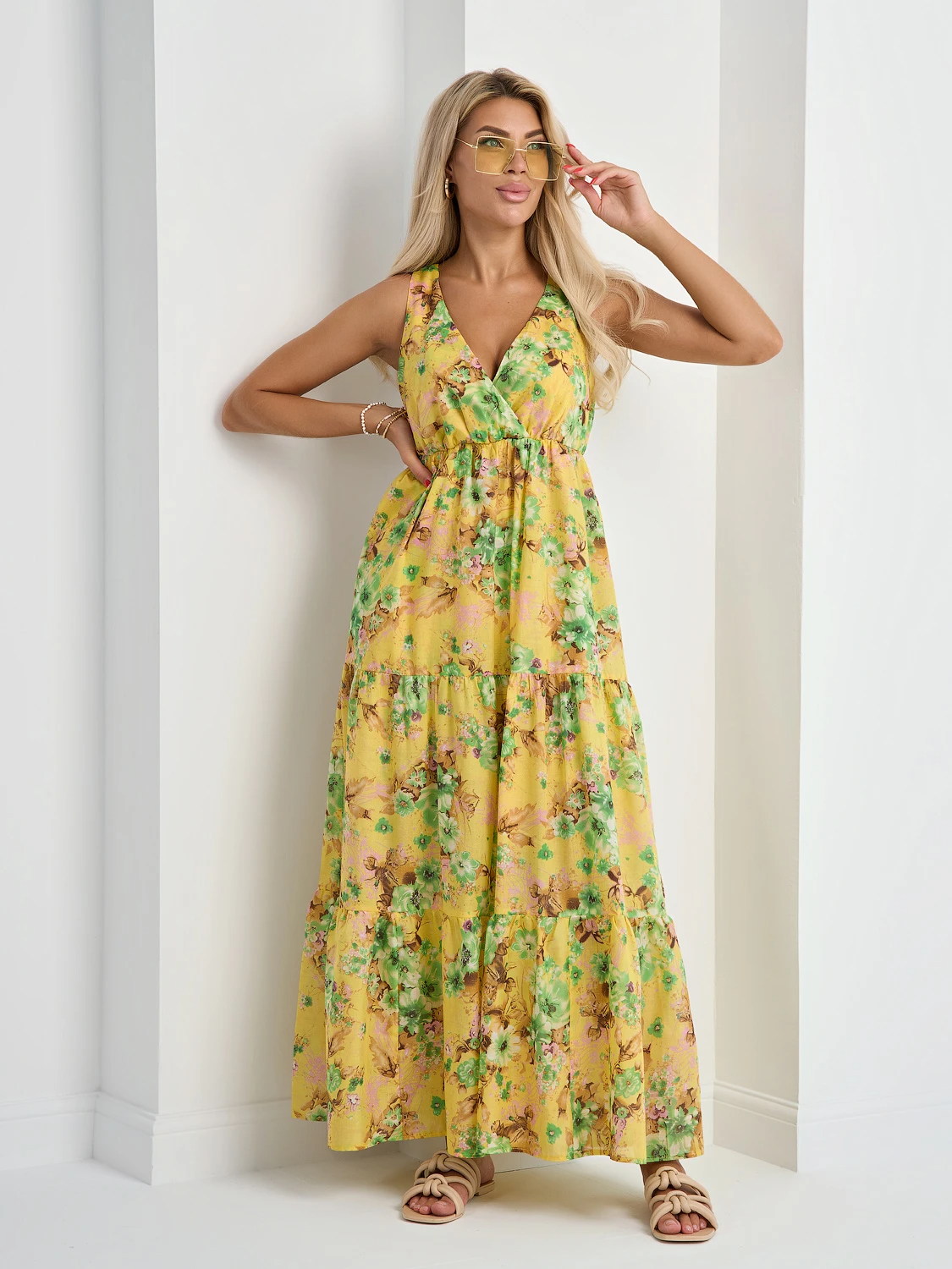Легкое платье с расклешенной ярусной юбкой.
