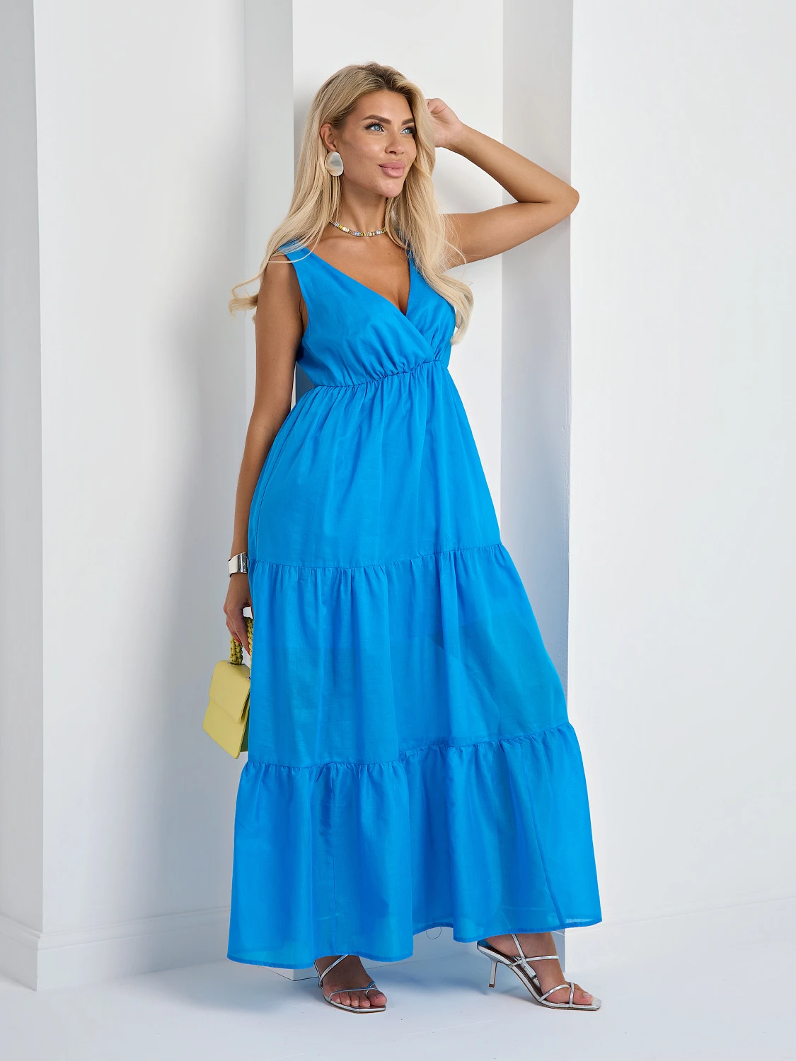 Легкое платье с расклешенной ярусной юбкой.