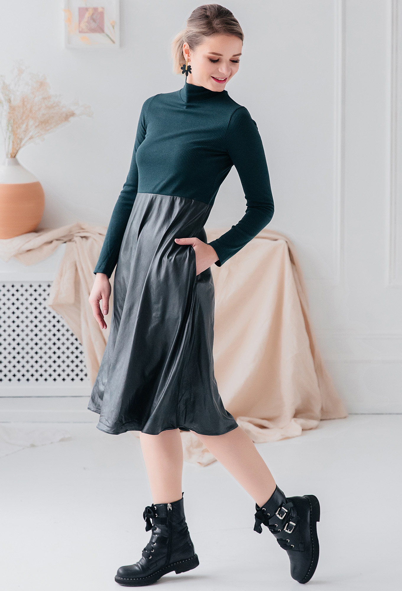 Модель: АСВ 2189 зеленый Рост: 16..показать4 см (девушка на фото ростом 164см) Сезон: Круглогодичный Тип ткани: Вискоза 43%, полиэстер 42%, нейлон 10%, эластан 5%Платье трапециевидного силуэта с длинным рукавом. Горловина с воротником стойкой. Перед и спинка отрезные.