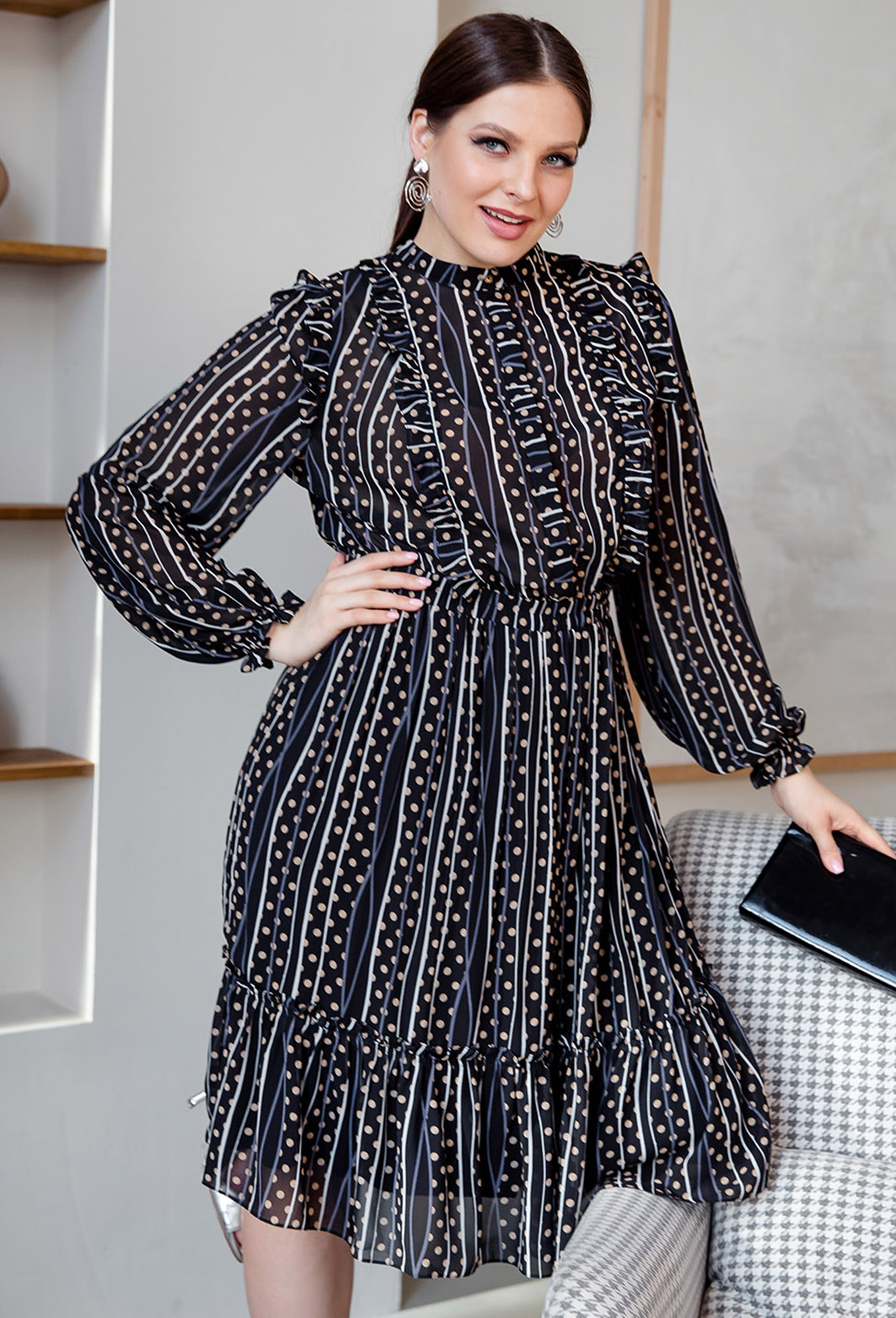 Модель: АСВ 2203 черный горох Рос..показатьт: 164 см (девушка на фото ростом 164см) Сезон: Круглогодичный Тип ткани: Платье- вискоза 65%, полиэстер 25%, нейлон 10%Подкладка- вискоза 95%, эластан 5%Платье полуприлегающего силуэта с длинным рукавом. Горловина округлая с воротником стойкой, застежка потайная на петли и пуговицы. Перед и спинка отрезные по линии талии, по низу рукава и по линии талии резинка.