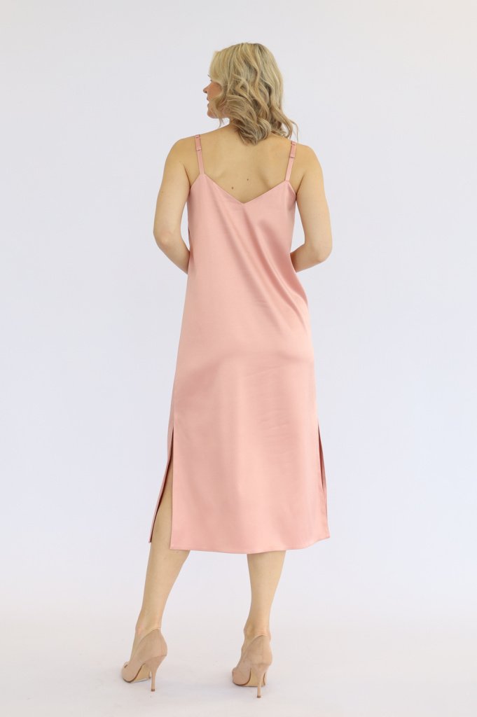 V-вырез по переду и спинке, регулируемые по длине бретели, боковые разрезы в швах.