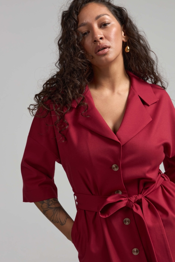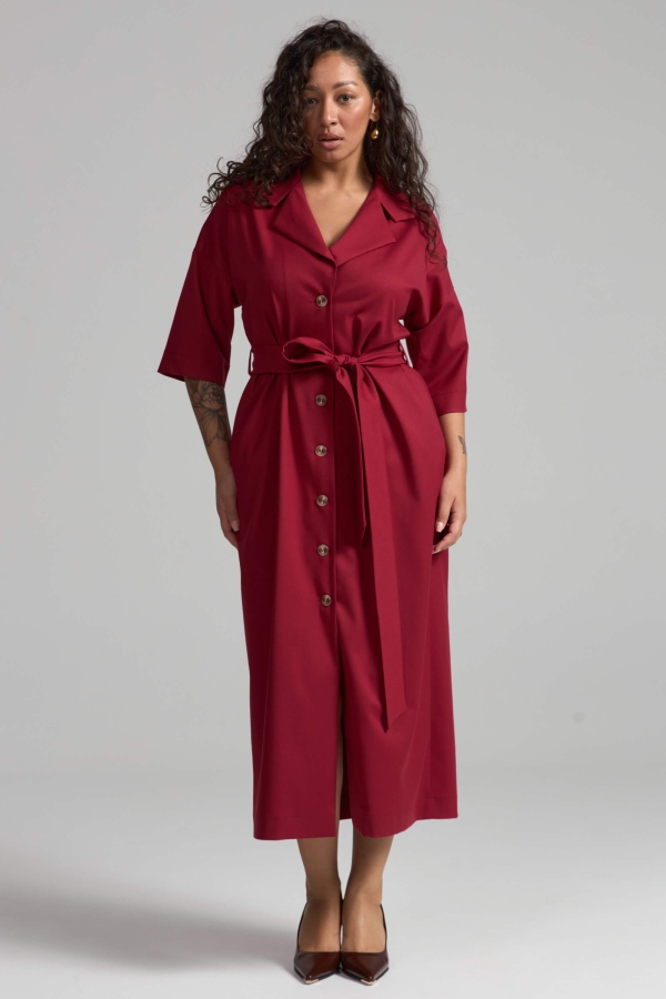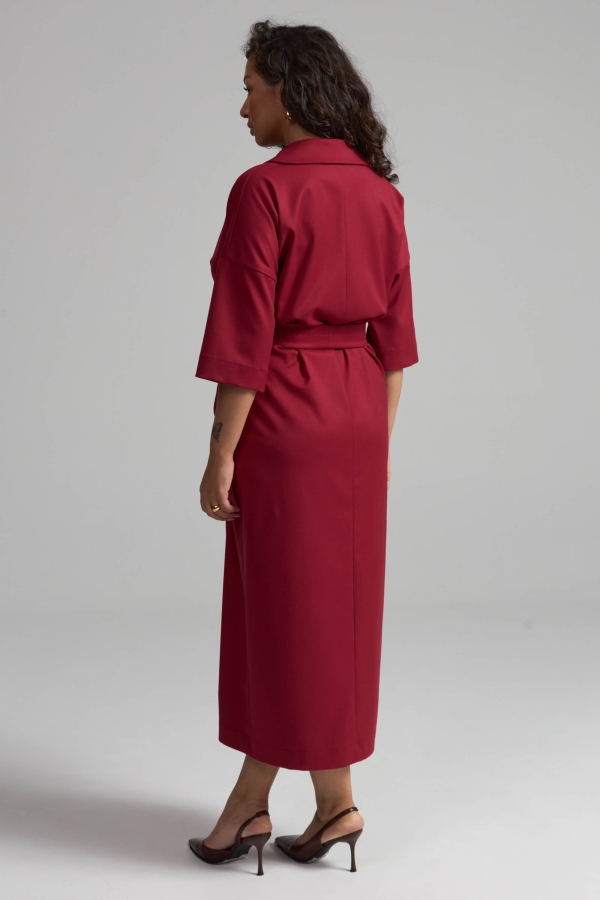 Платье прямого силуэта с необычным воротником и лацканами. Спущенное плечо, лиф на запах, наклонные карманами по переду. В комплекте пояс.