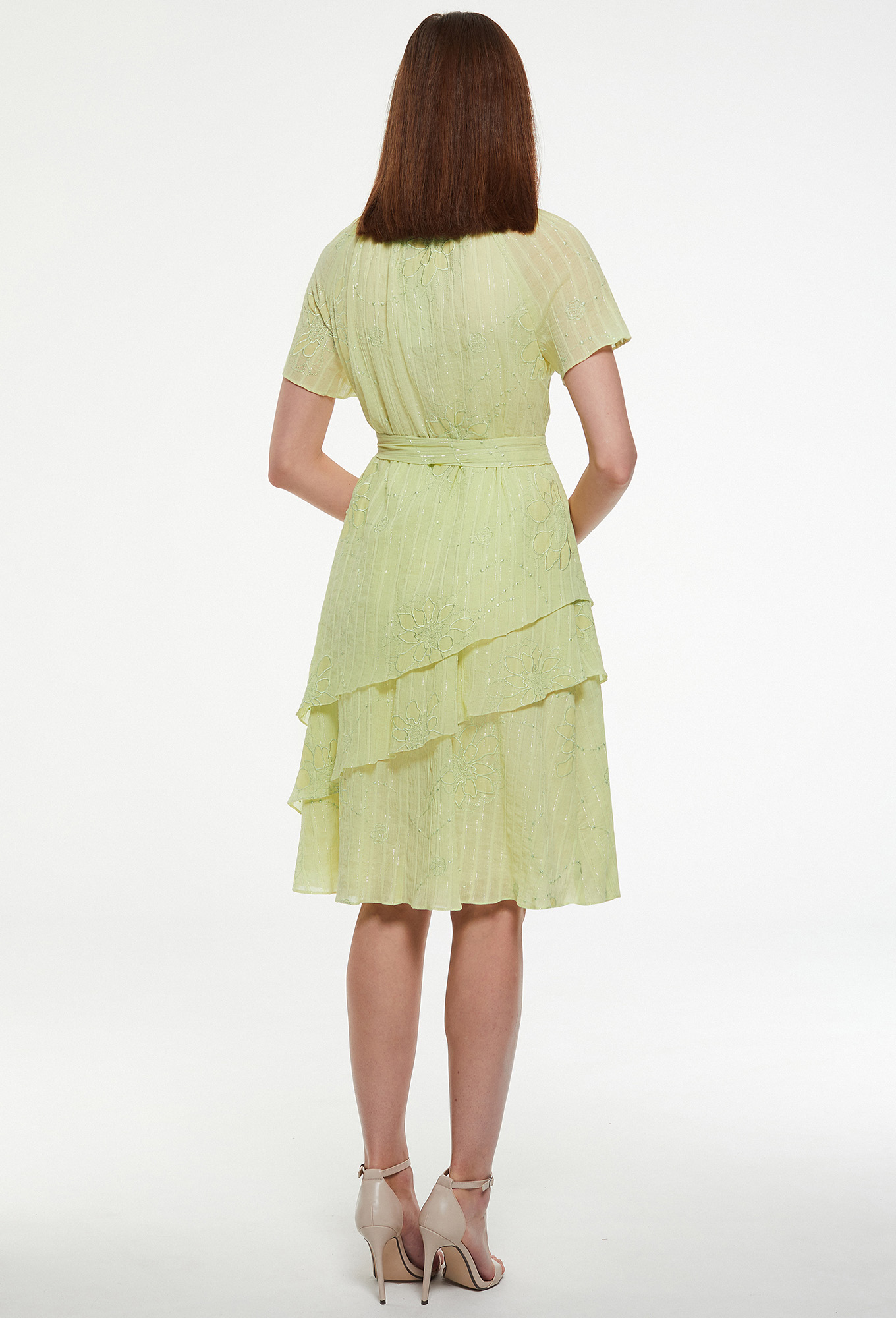 Модель: Базалини 3458 салатовый Р..показатьост: 170 см (девушка на фото ростом 170см) Сезон: Весна-Лето Тип ткани: 67% Полиэстер, 30% Хлопок, 3% ЛюрексПлатье A-образного силуэта из легкой фактурной ткани с эффектом многослойности. Горловина со сборкой. Рукав покроя реглан. Перед и спинка с асимметричными деталями. Линию талии подчеркивает широкий съемный пояс из основной ткани.