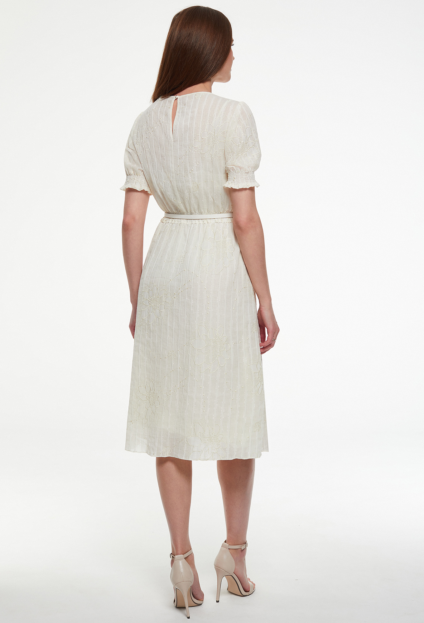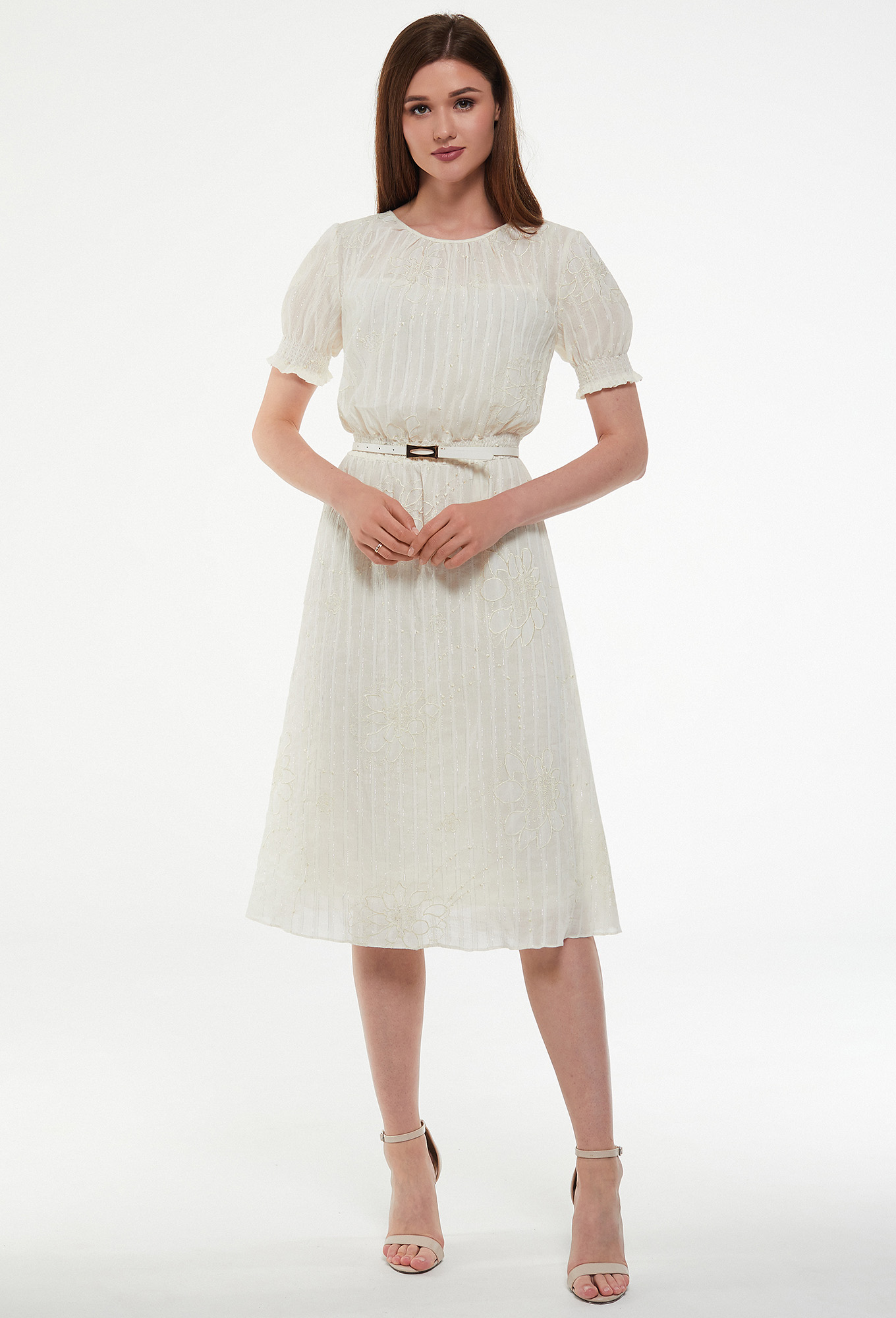 Модель: Базалини 3590 молочный Ро..показатьст: 170 см (девушка на фото ростом 170см) Сезон: Весна-Лето Тип ткани: 67% Полиэстер, 30% Хлопок, 3% ЛюрексПлатье миди свободного кроя с круглым вырезом горловины с небольшой сборкой по переду и застежкой на петлю и пуговицу по спинке. Талия акцентирована сборкой на тонкие резинки, что делает силуэт более женственным. Романтичность платью придает рукав-фонарик. Платье дополнено поясом-ремнем с пряжкой.