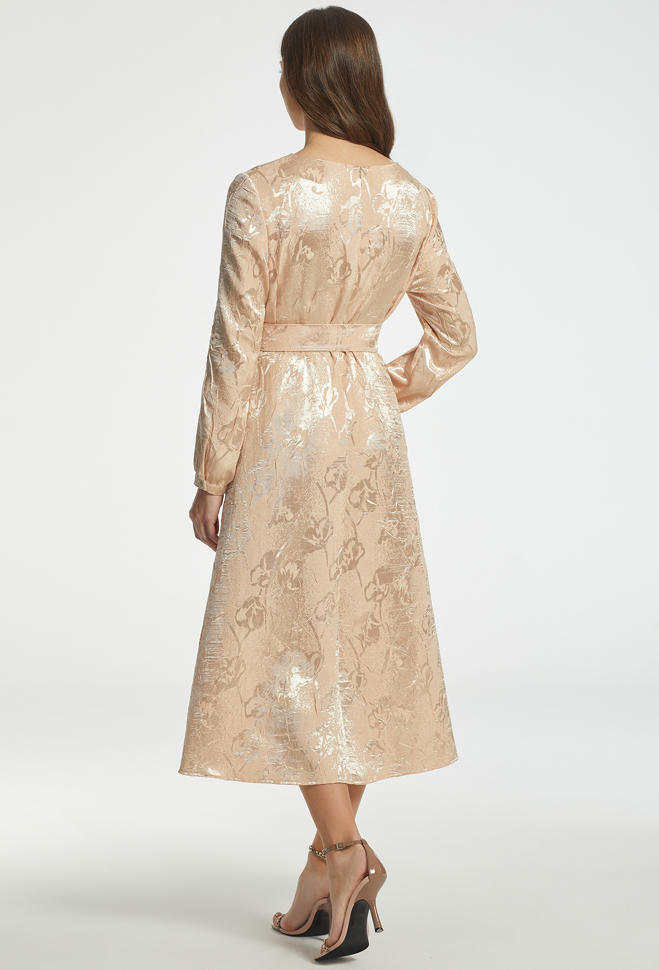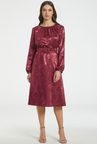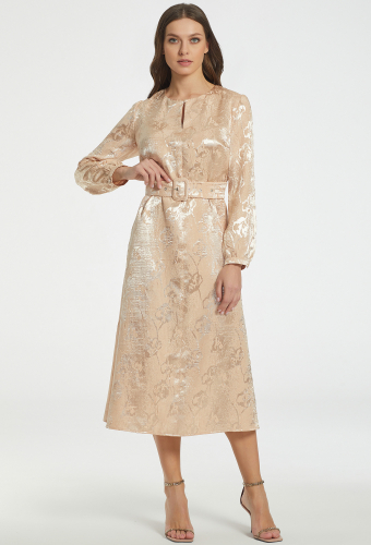 Модель: Базалини 3662 золото Рост..показать: 170 см (девушка на фото ростом 170см) Сезон: Круглогодичный Тип ткани: 100% ПолиэстерПлатье миди А-образного силуэта с круглым вырезом горловины. В среднем шве переда обработана застёжка на одну навесную петлю и пуговицу. В среднем шве спинки обработана потайная молния. Рукава втачные со сборкой по низу и манжетой на одну прорезную петлю и пуговицу. Платье дополняется поясом ремнём из основной ткани с пряжкой.