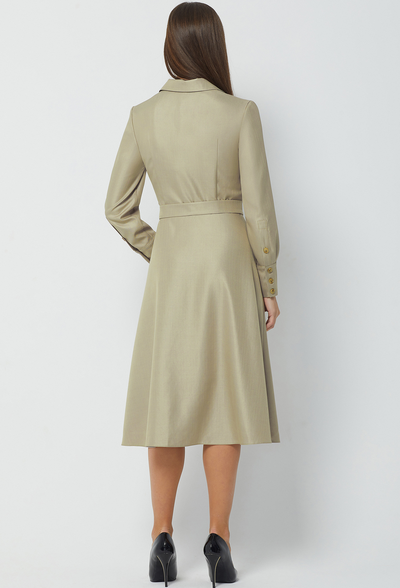Модель: Базалини 3885 песочный Ро..показатьст: 170 см (девушка на фото ростом 170см) Сезон: Круглогодичный Тип ткани: Полиэстер- 65%, Вискоза- 32% , Эластан- 3%Платье-миди полуприлегающего силуэта, отрезное по линии талии , с отложным воротником с лацканами - перед с центрально-бортовой застёжкой на три петли и пуговицы, настрочной листочкой - рукава втачные с широкими манжетами по низу и отделочными поговицами - в левом боковом шве обработана потайная молния - платье дополняется поясом с пряжкой из основной ткани