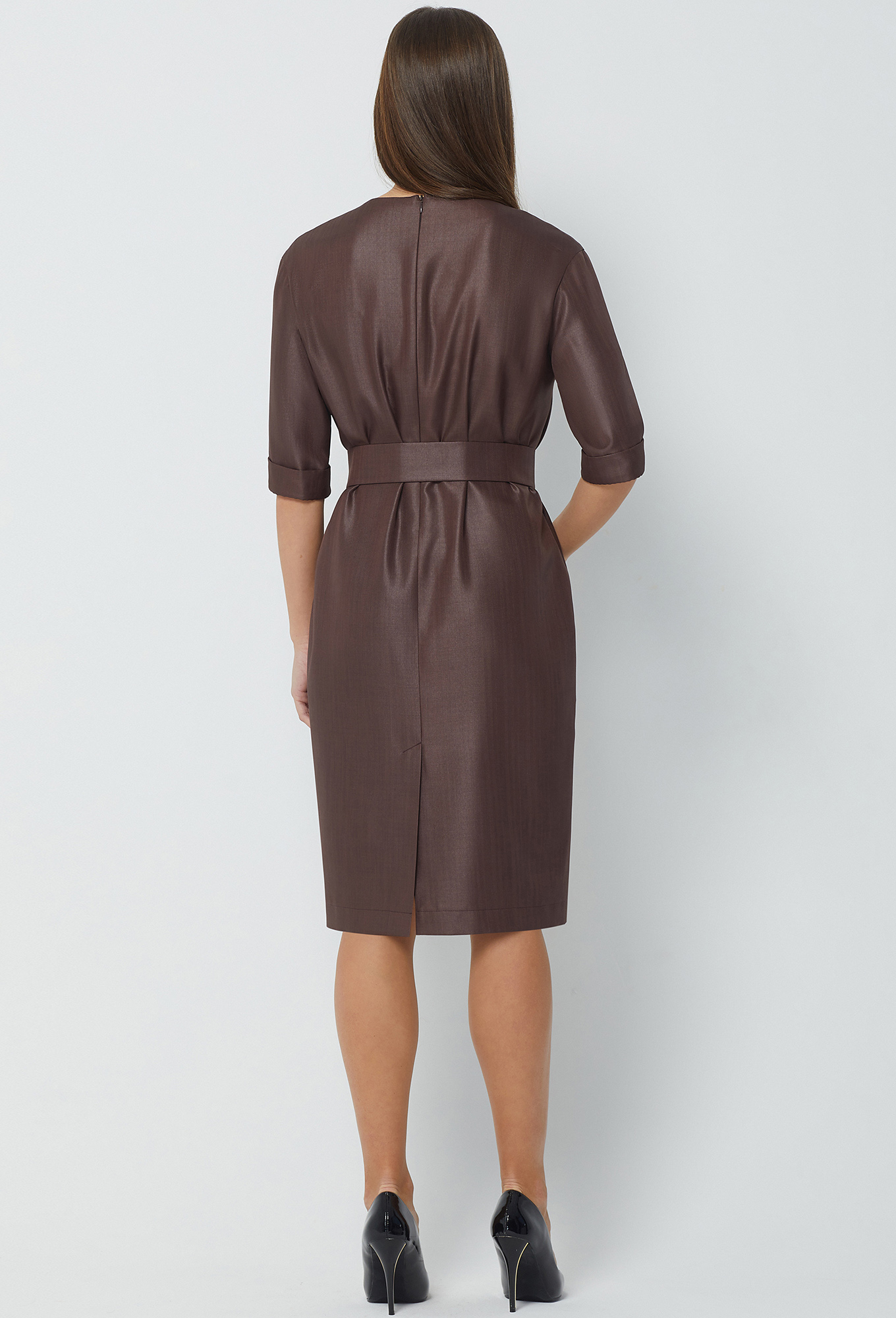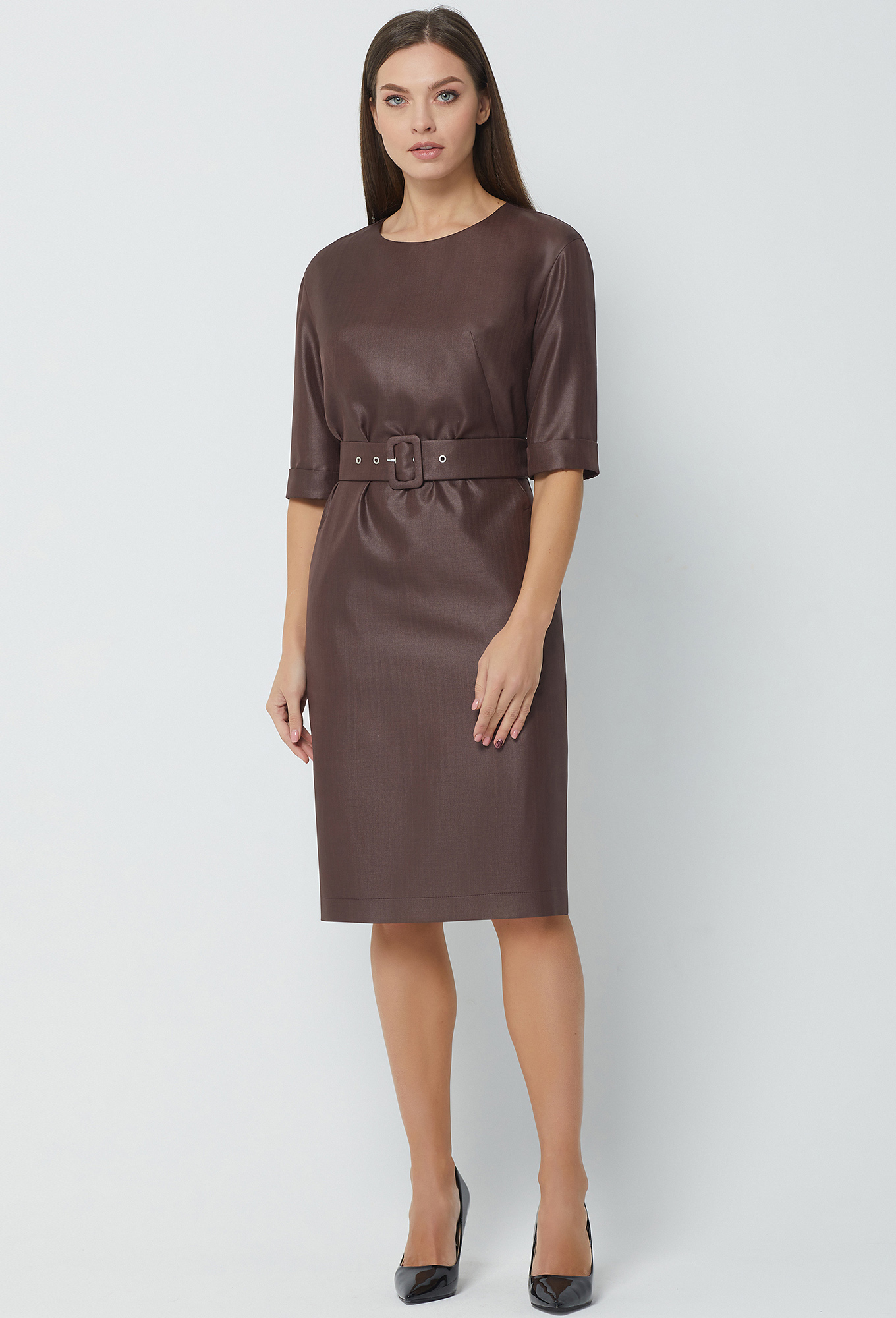 Модель: Базалини 3951 коричневый ..показатьРост: 170 см (девушка на фото ростом 170см) Сезон: Всесезонный Тип ткани: Полиэстер- 65%, Вискоза- 32% , Эластан- 3%Платье прямого силуэта с округлым вырезом горловины, слегка спущенной линией плеча, выполнено из костюмно-плательной ткани. Перед с косыми вытачками, в которых обработаны карманы. В среднем шве спинки обработаны потайная молния и шлица. Рукава одношовные с отложными манжетами. Дополняется поясом с пряжкой из основной ткани.