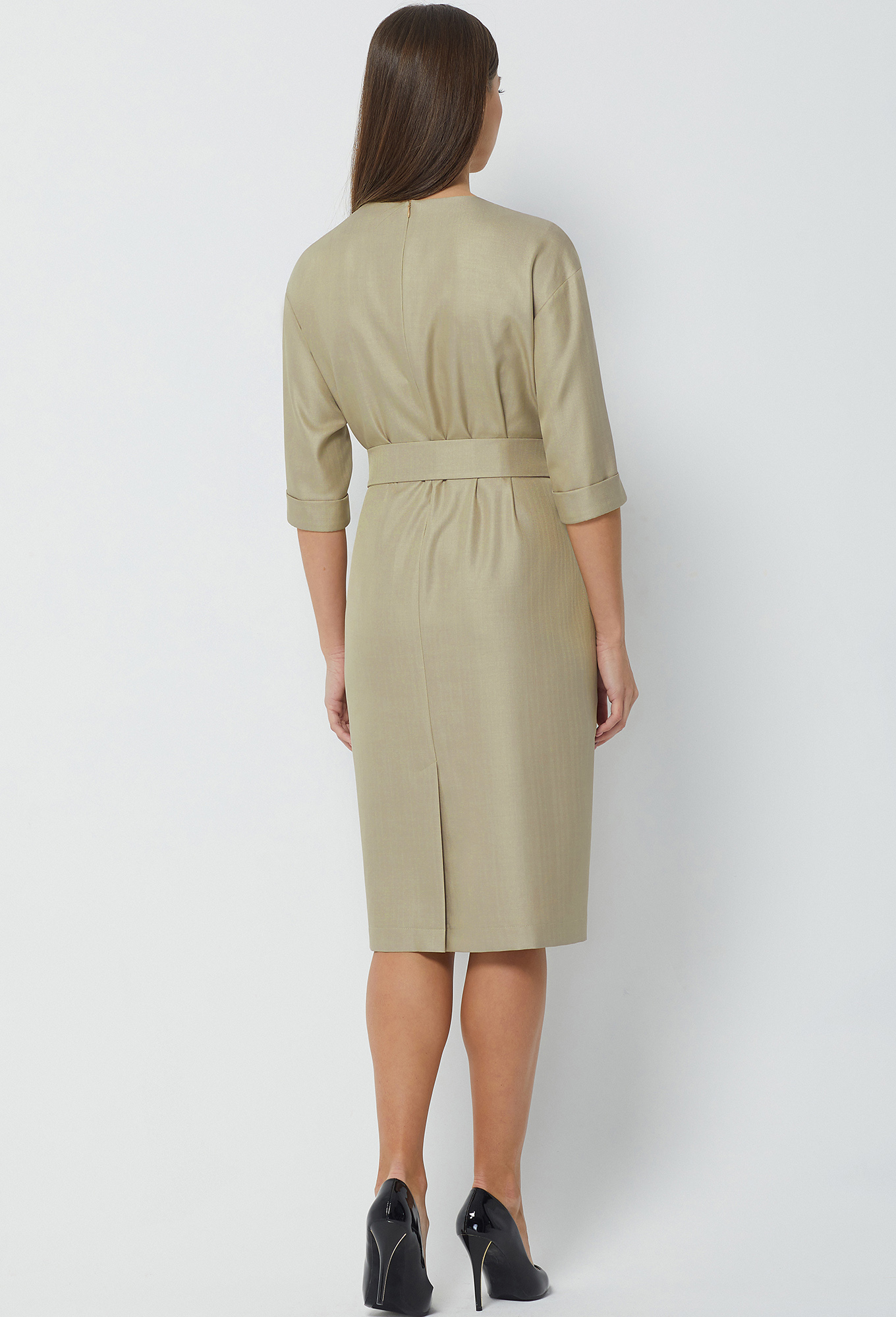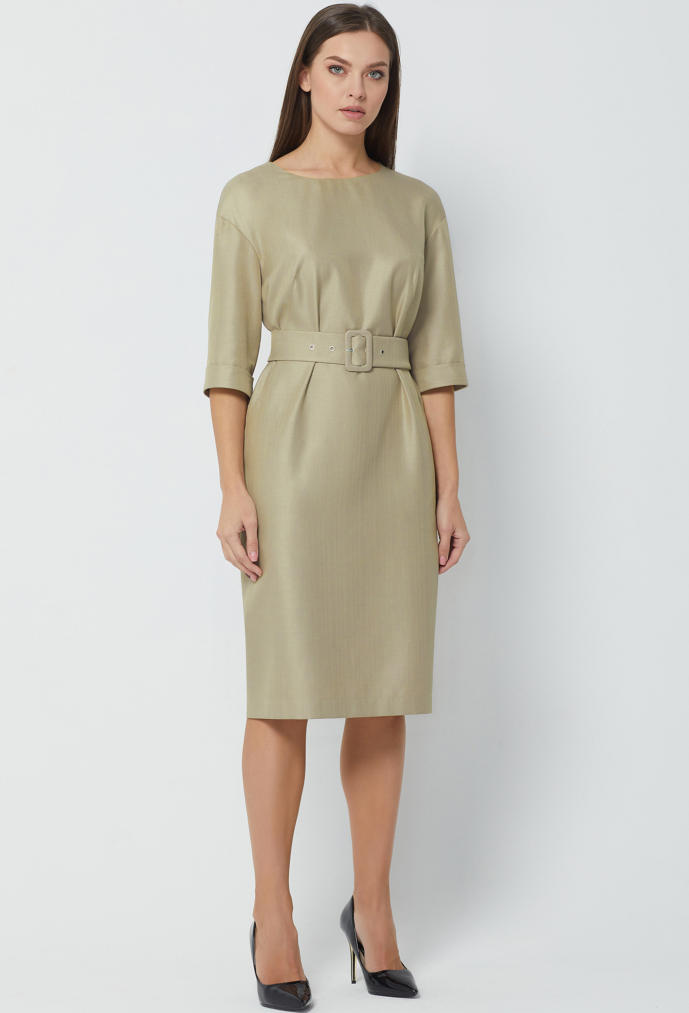 Модель: Базалини 3951 песочный Ро..показатьст: 170 см (девушка на фото ростом 170см) Сезон: Всесезонный Тип ткани: Полиэстер- 65%, Вискоза- 32% , Эластан- 3%Платье прямого силуэта с округлым вырезом горловины, слегка спущенной линией плеча, выполнено из костюмно-плательной ткани. Перед с косыми вытачками, в которых обработаны карманы. В среднем шве спинки обработаны потайная молния и шлица. Рукава одношовные с отложными манжетами. Дополняется поясом с пряжкой из основной ткани.
