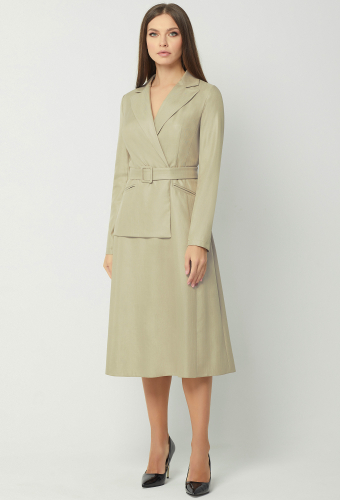 Модель: Базалини 3958 песочный Ро..показатьст: 170 см (девушка на фото ростом 170см) Сезон: Всесезонный Тип ткани: Полиэстер- 65%, Вискоза- 32% , Эластан- 3%Платье миди интересного кроя, выполнено из костюмно-плательной ткани, приталенного силуэта с застёжкой на потайную молнию в боковом шве. Спереди имитация полочки жакета и два косых кармана-обманки с рамками. Спинка со средним швом и двумя рельефами. Рукава втачные двухшовные. Воротник отложной с лацканами. Платье дополняется поясом с пряжкой из основной ткани.