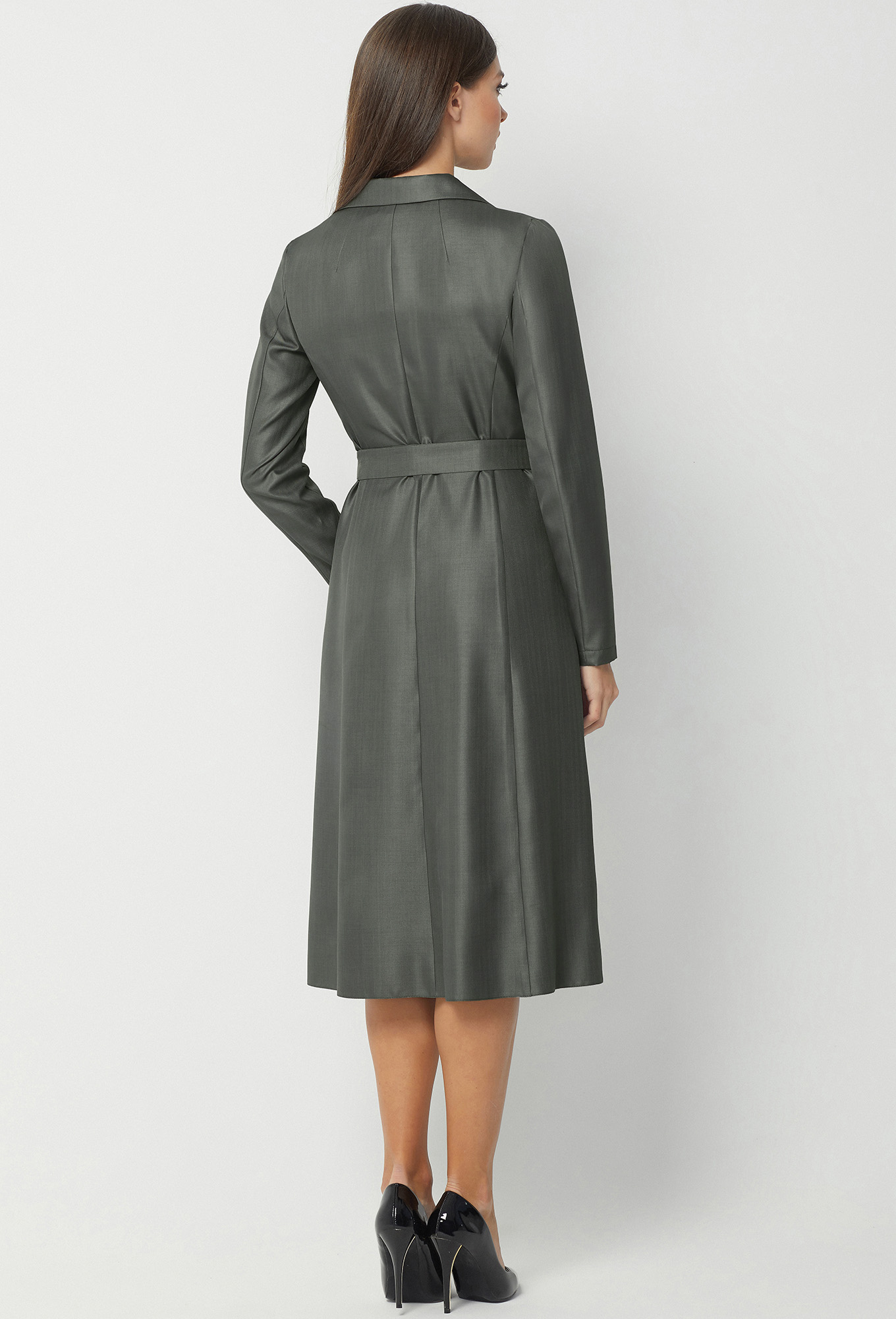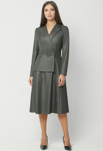 Модель: Базалини 3958 серый-хаки ..показатьРост: 170 см (девушка на фото ростом 170см) Сезон: Всесезонный Тип ткани: Полиэстер- 65%, Вискоза- 32% , Эластан- 3%Платье миди интересного кроя, выполнено из костюмно-плательной ткани, приталенного силуэта с застёжкой на потайную молнию в боковом шве. Спереди имитация полочки жакета и два косых кармана-обманки с рамками. Спинка со средним швом и двумя рельефами. Рукава втачные двухшовные. Воротник отложной с лацканами. Платье дополняется поясом с пряжкой из основной ткани.