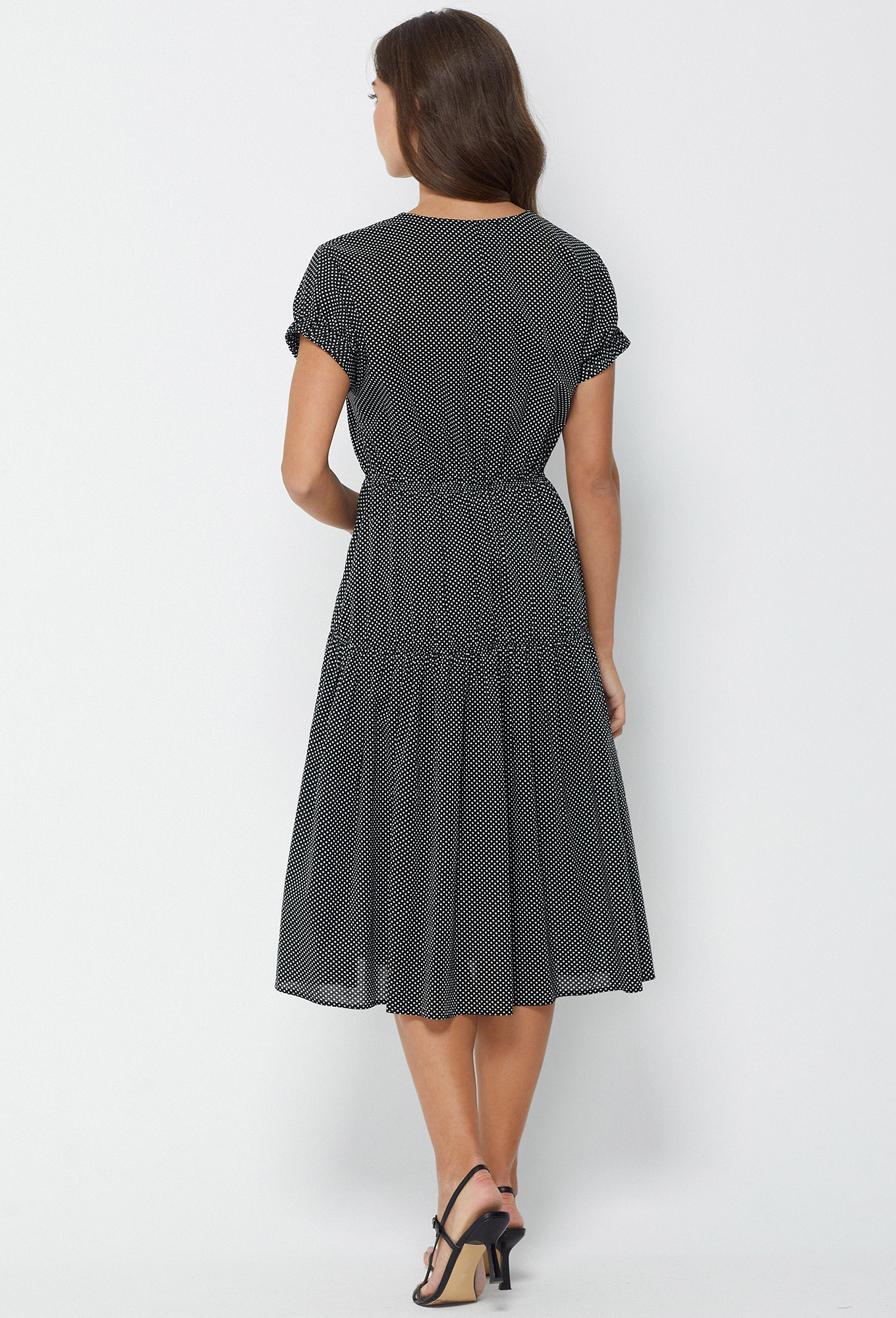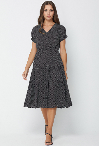 Модель: Базалини 4151 черный в горох ..показатьРост: 170 см (девушка на фото ростом 170см) Сезон: Весна-Лето Тип ткани: 100% - МодалРомантичное платье-миди интересного кроя выполнено из принтованной ткани, отрезное по линии талии и присборенное на резинку, с V-образным вырезом горловины по переду, цельнокроенными рукавами, частично присборенными на резинку и с оборкой по низу.