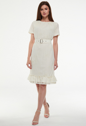 Модель: Базалини 4243 молочный Ро..показатьст: 170 см (девушка на фото ростом 170см) Сезон: Весна-Лето Тип ткани: 67% Полиэстер, 30% Хлопок, 3% ЛюрексПлатье прямого силуэта, слегка расширенное книзу. С округлой формой горловины, по переду со складками, низ платья с оборкой. Рукава втачные одношовные, линия талии подчёркнута поясом из основной ткани с пряжкой.