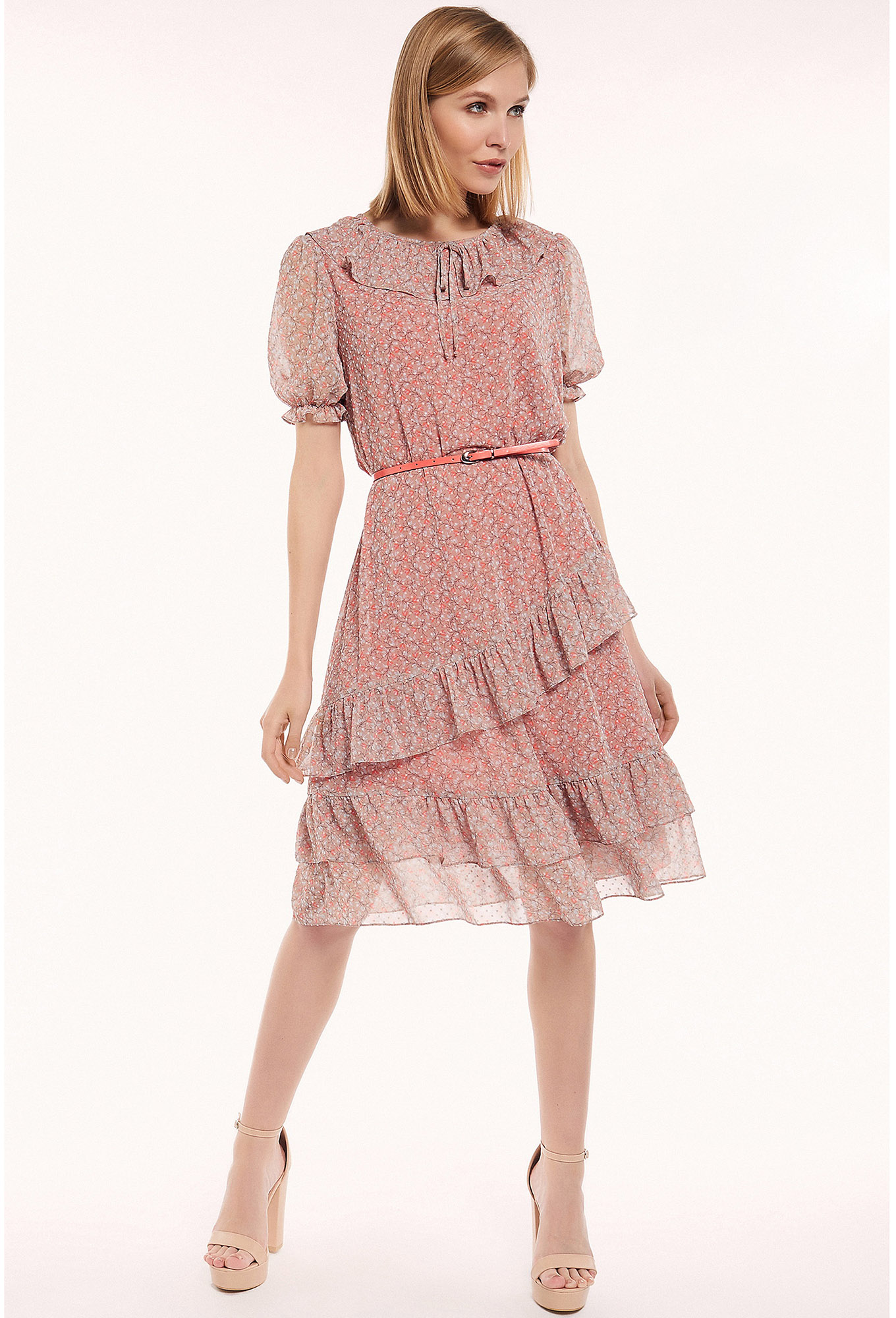 Модель: Базалини 4284 розовый Рос..показатьт: 170 см (девушка на фото ростом 170см) Сезон: Весна-Лето Тип ткани: 100% полиэстерРомантическое платье А-образного силуэта из принтованого шифона в мелкий цветочек и горошек, отрезное по талии и собранное на резинку, с округлой формой горловины, с оборками по низу, горловина переда с оборками в виде имитации воротника с завязкой, по спинке обработана застежка на навесную петлю и пуговицу, рукава-фонарики. Дополняется поясом-ремнем с пряжкой.