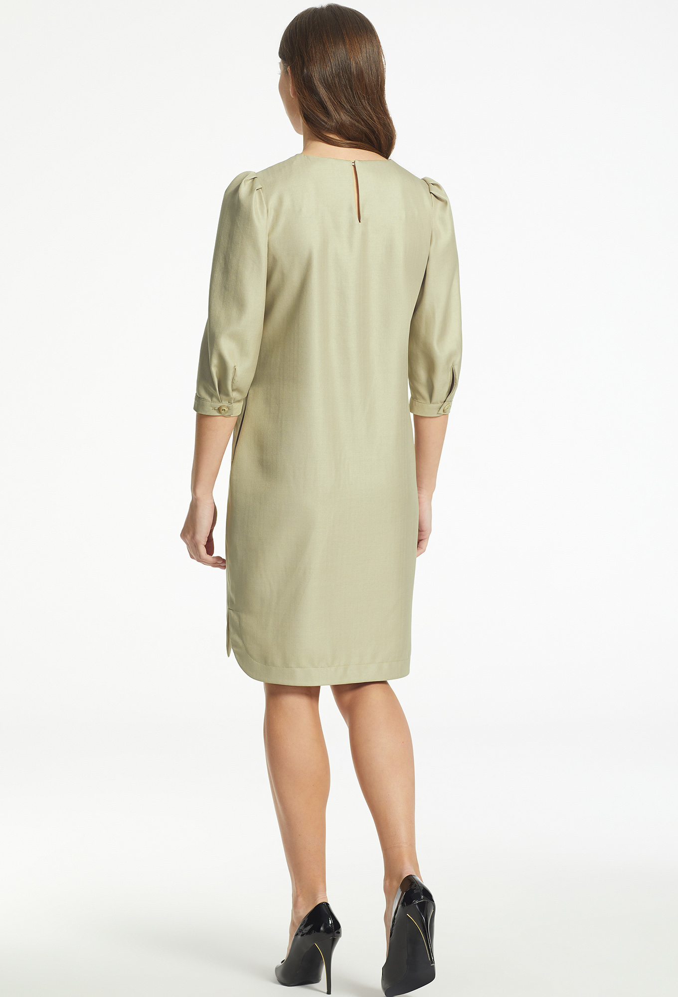 Модель: Базалини 4375 песочный Ро..показатьст: 170 см (девушка на фото ростом 170см) Сезон: Круглогодичный Тип ткани: Полиэстер- 65%, Вискоза- 32% , Эластан- 3%Простое на первый взгляд платье прямого силуэта, дополненное интересными элементами, сшито из приятной к телу ткани. Модель с фигурной формой низа, укороченными рукавами со складками по окату и с узкими манжетами с отделочными пуговицами. Спинка с застежкой-каплей с потайной пуговицей.
