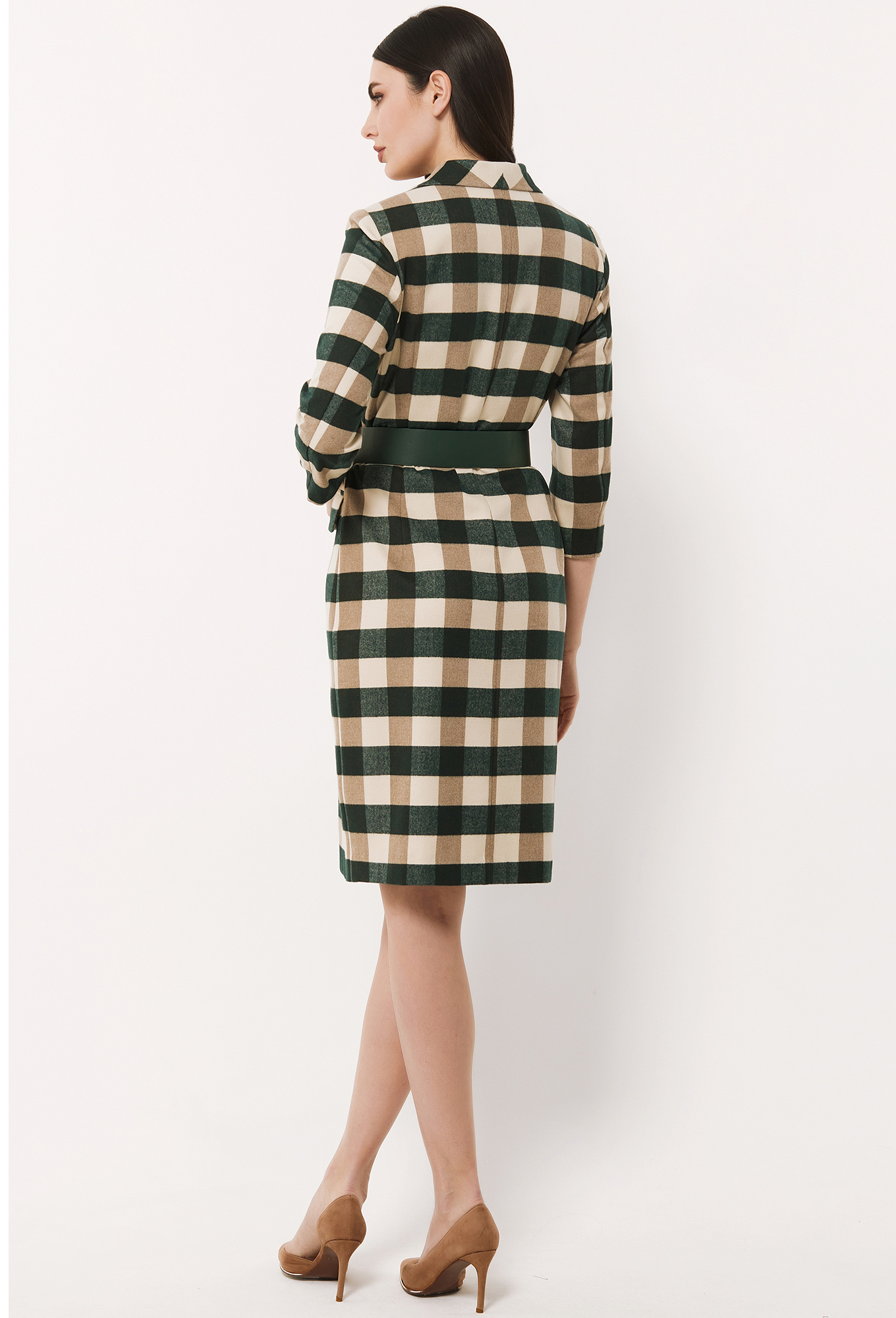 Модель: Базалини 4491 зелено-бежевый ..показатьРост: 170 см (девушка на фото ростом 170см) Сезон: Осень-Зима Тип ткани: 63% полиэстер, 34% вискоза, 3% эластанПлатье полуприлегающего силуэта с втачными укороченными рукавами. Модель стильно смотрится за счёт эффектного воротника «Апаш» с широкими лацканами, двубортной застёжке с пуговицами, а также ремнем  с пряжкой. По переду платья обработаны функциональные карманы с клапанами и рамками.  Ремень может отличаться от студийного фото.
