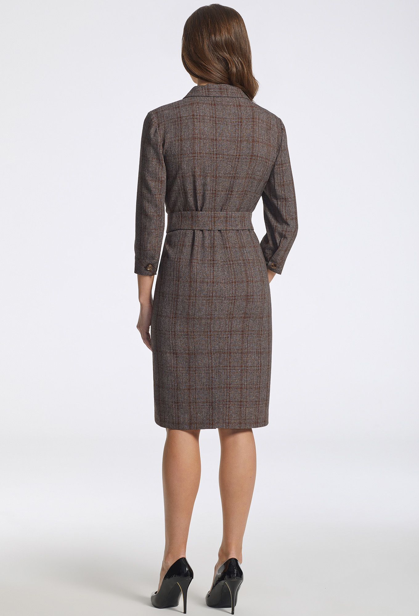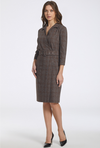 Модель: Базалини 4504 серо-коричневый клет..показатька Рост: 170 см (девушка на фото ростом 170см) Сезон: Круглогодичный Тип ткани: 63% полиэстер, 34% вискоза, 3% эластанОригинальное платье полуприлегающего силуэта, с интересными решениями кроя – отлично подойдет для делового образа. По переду платье отрезное по талии, верхняя часть платья с имитацией запаха и V-образным вырезом горловины, который способен зрительно поиграть с длиной шеи, нижняя часть со складкой, которая придаёт больше динамичности при движении. В среднем шве спинки обработана шлица. Взгляд к платью также приковывают воротник-апаш фигурной формы и укороченные втачные рукава с манжетами и отделочными пуговицами. Линию талии красиво подчёркивает пояс-ремень из основной ткани.