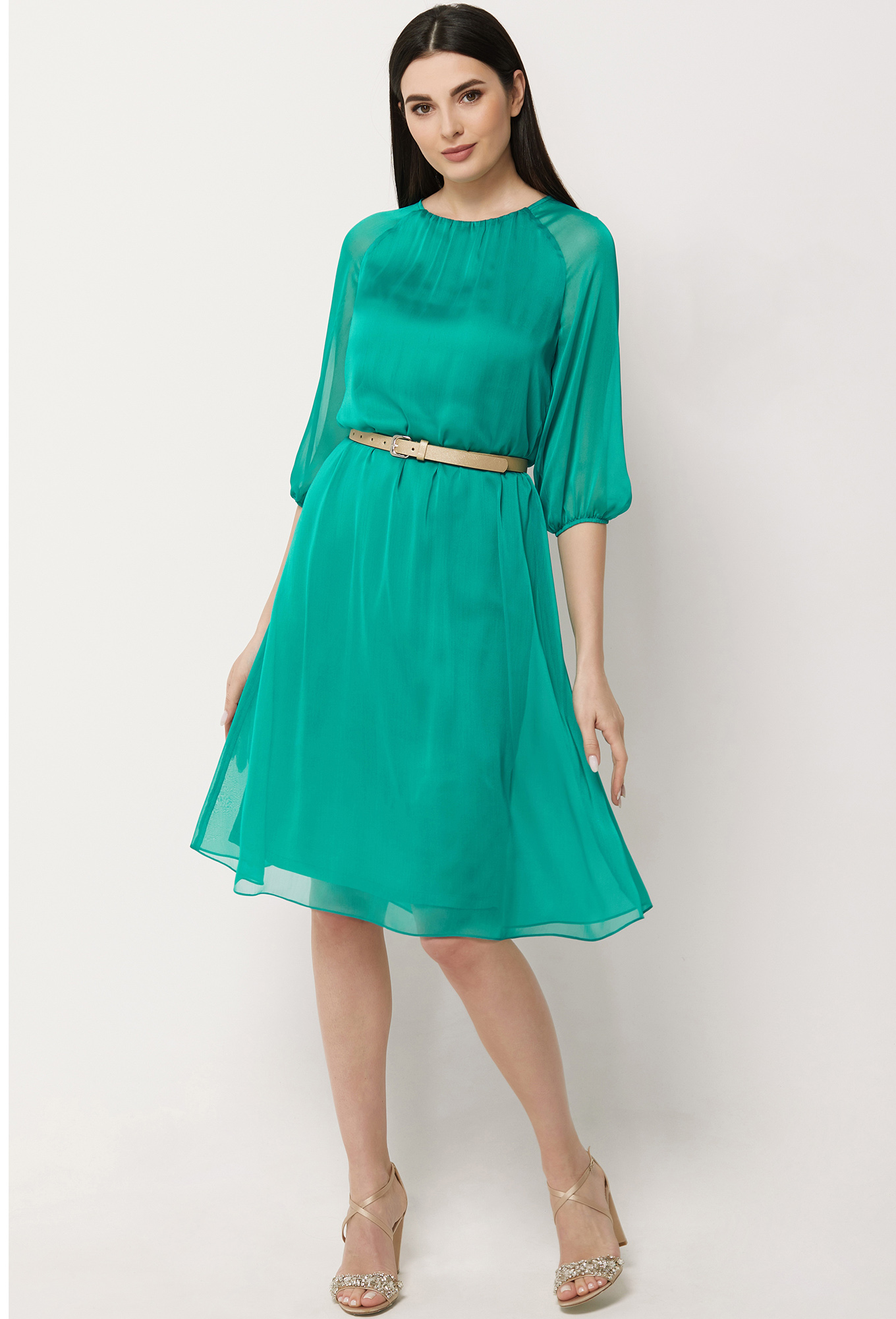 Модель: Базалини 4569 зеленый Рос..показатьт: 170 см (девушка на фото ростом 170см) Сезон: Всесезонный Тип ткани: Платье – 100% полиэстерЯркий оттенок задаёт настроение платью, а интересный крой, скульптурные драпировки и летящий в движении свободный силуэт непременно помогут попасть в центр внимания. Изделие со сборкой по горловине переда и укороченными прозрачными рукавами покроя реглан со сборкой по низу, собранной на узкую эластичную тесьму, сшито из лёгкого фактурного шифона с деликатным глянцевым блеском и 100% вискозной ткани. Для удобства в носке, по спинке платья обработана щелевидная застёжка на петлю и пуговицу. Чтобы сделать модель еще более эффектной – линию талии подчеркнули контрастным поясом-ремнём с пряжкой.