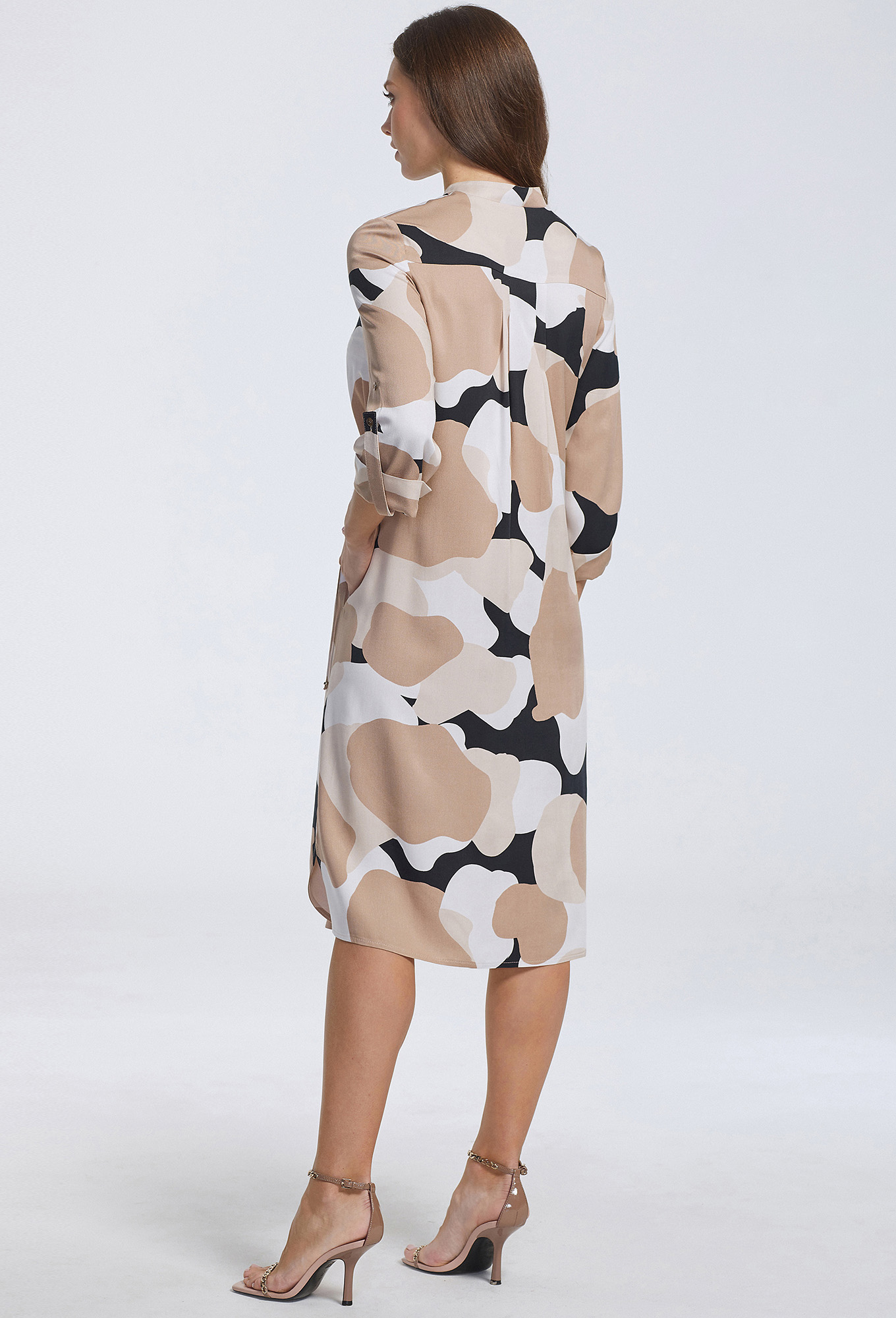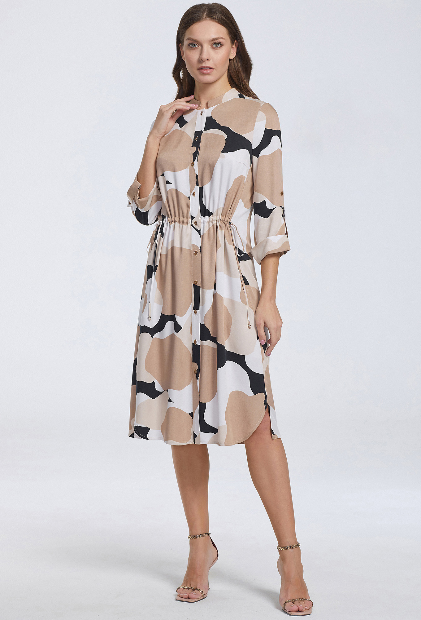 Модель: Базалини 4572 бежево-черный <..показатьli>Рост: 170 см (девушка на фото ростом 170см) Сезон: Весна-Лето Тип ткани: 100% вискозаИнтересная модель платья-рубашки с фигурной формой низа, привлекает к себе своим необычным кроем и модным, с красивым сочетанием цветов, дизайном. Изделие выполнили из мягкой, приятной к телу итальянской вискозной ткани. Модель свободного кроя, с узким воротником-стойкой, со смещенными на перед боковыми швами, в которых обработаны карманы. Перед с центральной застёжкой на петли и пуговицы и кулисой в области талии, помогающей регулировать силуэт. Спинка с кокеткой и складками. Рукава втачные укороченные с отложными манжетами, патами и отделочными пуговицами.