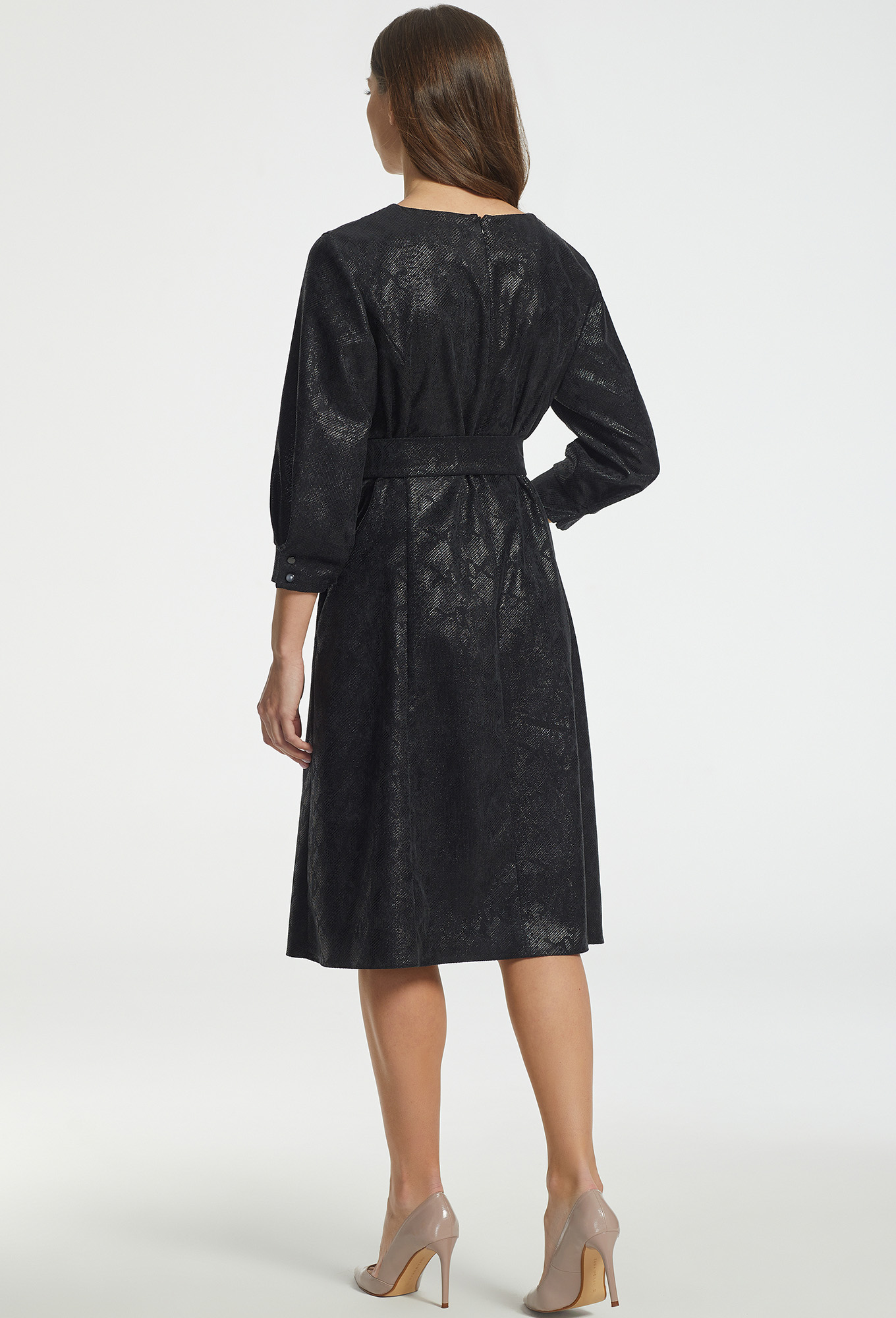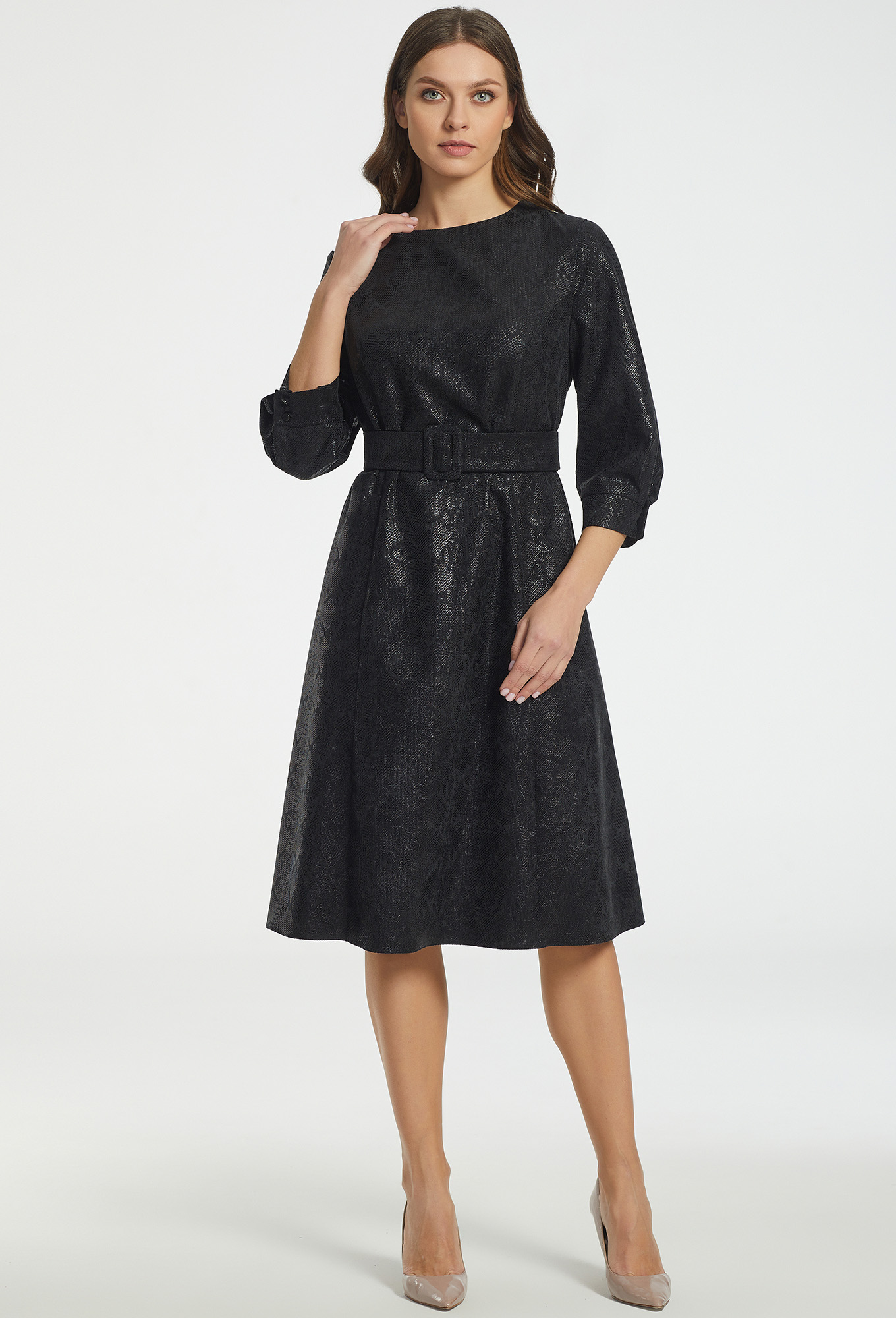 Модель: Базалини 4591 черный Рост..показать: 170 см (девушка на фото ростом 170см) Сезон: Круглогодичный Тип ткани: 63% полиэстер, 34% вискоза, 3% эластанЭлегантное платье Х-образного силуэта выполнено из красивой ткани. Романтичность платью придают интересного кроя укороченные рукава со складками и притачными манжетами с декоративными пуговицами. В среднем шве спинки обработана потайная молния, а в боковых швах функциональные карманы. Чтобы сделать модель еще более эффектной, линию талии подчеркнули широким поясом с пряжкой из основной ткани.