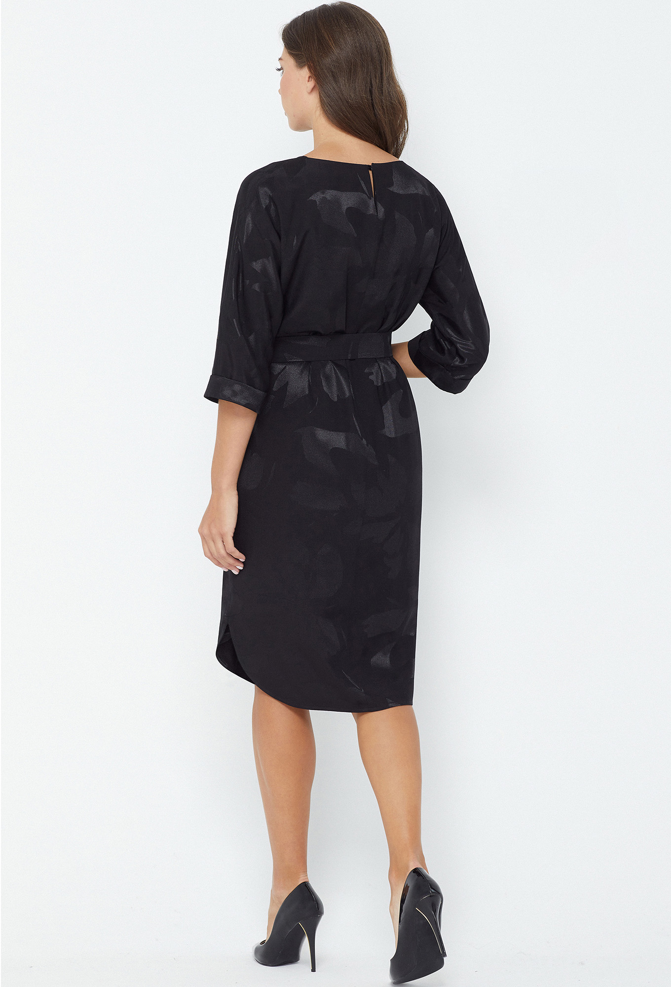 Модель: Базалини 4600 черный Рост..показать: 170 см (девушка на фото ростом 170см) Сезон: Круглогодичный Тип ткани: 100% вискозыНесмотря на лаконичный крой платья, в нём вы обязательно окажетесь в центре внимания, благодаря красивой ткани с интересным сочетанием матовой основы и цветочного атласного дизайна, а также некоторым элементам кроя. Модель свободного кроя с цельнокроенными рукавами, с приталенными отложными манжетами и фигурной формой низа. В среднем шве спинки обработана застёжка на навесную петлю и пуговицу, в боковых швах обработаны функциональные карманы. Линия талии красиво подчёркивается интересным поясом с пуговицами из основной ткани.