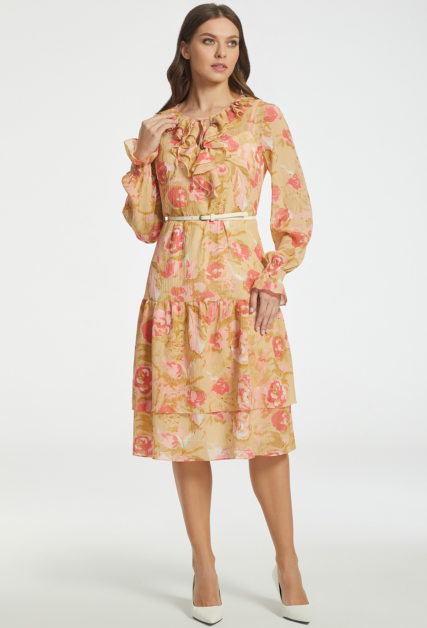 Модель: Базалини 4616 бежевый цветы <..показатьli>Рост: 170 см (девушка на фото ростом 170см) Сезон: Круглогодичный Тип ткани: 100% полиэстерНежные цветы задают романтическое настроение платью, а интересный крой, драпировки и летящий в движении свободный силуэт непременно помогут попасть в центр внимания. Изделие с оборками по низу, с завязкой и оборками по горловине переда, переходящими в жабо, сшили из фактурного шифона и дополнили нижним платьем . Лёгкость модели, также придают полупрозрачные рукава с цельновыкроеными эластичными манжетами, сформированными из нескольких рядов тонких резинок и оборками. Линию талии красиво подчёркивает пояс-ремень с пряжкой.
