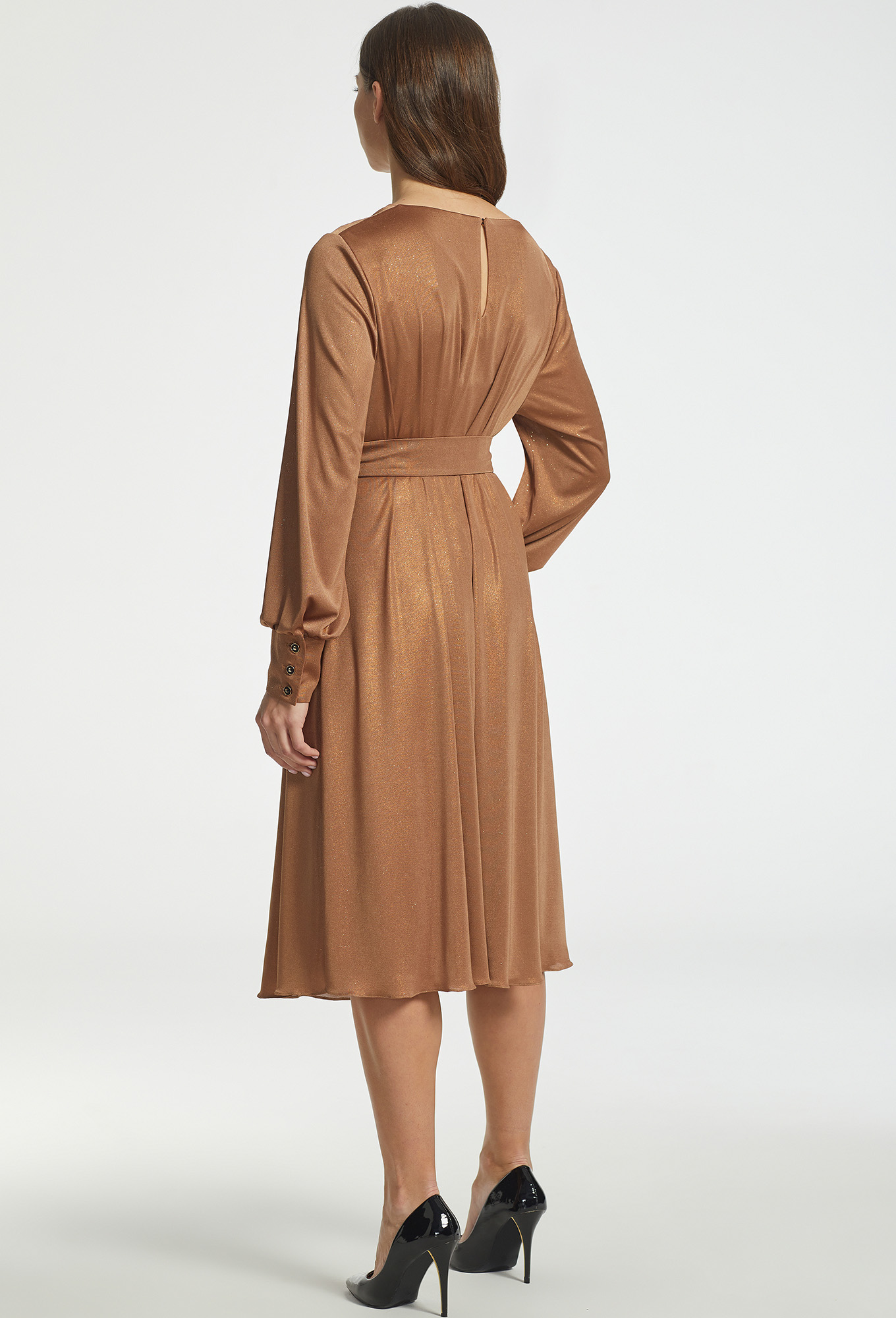 Модель: Базалини 4635 бежево-золотой ..показатьРост: 170 см (девушка на фото ростом 170см) Сезон: Круглогодичный Тип ткани: 100% полиэстерРоскошное платье А-образного силуэта из струящегося трикотажа со сверкающей нитью в тон. Вырез горловины «качели» красиво подчёркивает линию декольте. Романтичность платью придают рукава со сборкой по низу с широкими манжетами и отделочными пуговицами-бусинами в тон платья. Для удобства в эксплуатации по спинке предусмотрена каплевидная застёжка на навесную петлю и пуговицу. Чтобы сделать модель ещё более эффектной, линию талии подчеркнули широким поясом с пряжкой из основной ткани.