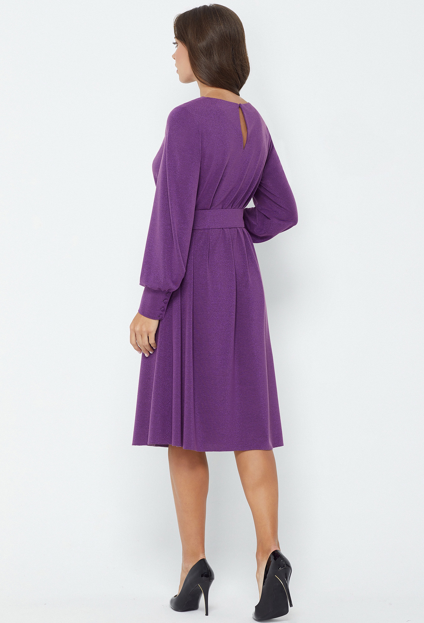 Модель: Базалини 4635 сирень Рост..показать: 170 см (девушка на фото ростом 170см) Сезон: Круглогодичный Тип ткани: 67% полиэстер, 30% вискоза, 3% эластанРоскошное платье А-образного силуэта из струящегося трикотажа со сверкающей нитью в тон. Вырез горловины «качели» красиво подчёркивает линию декольте. Романтичность платью придают рукава со сборкой по низу с широкими манжетами и отделочными пуговицами-бусинами в тон платья. Для удобства в эксплуатации по спинке предусмотрена каплевидная застёжка на навесную петлю и пуговицу.