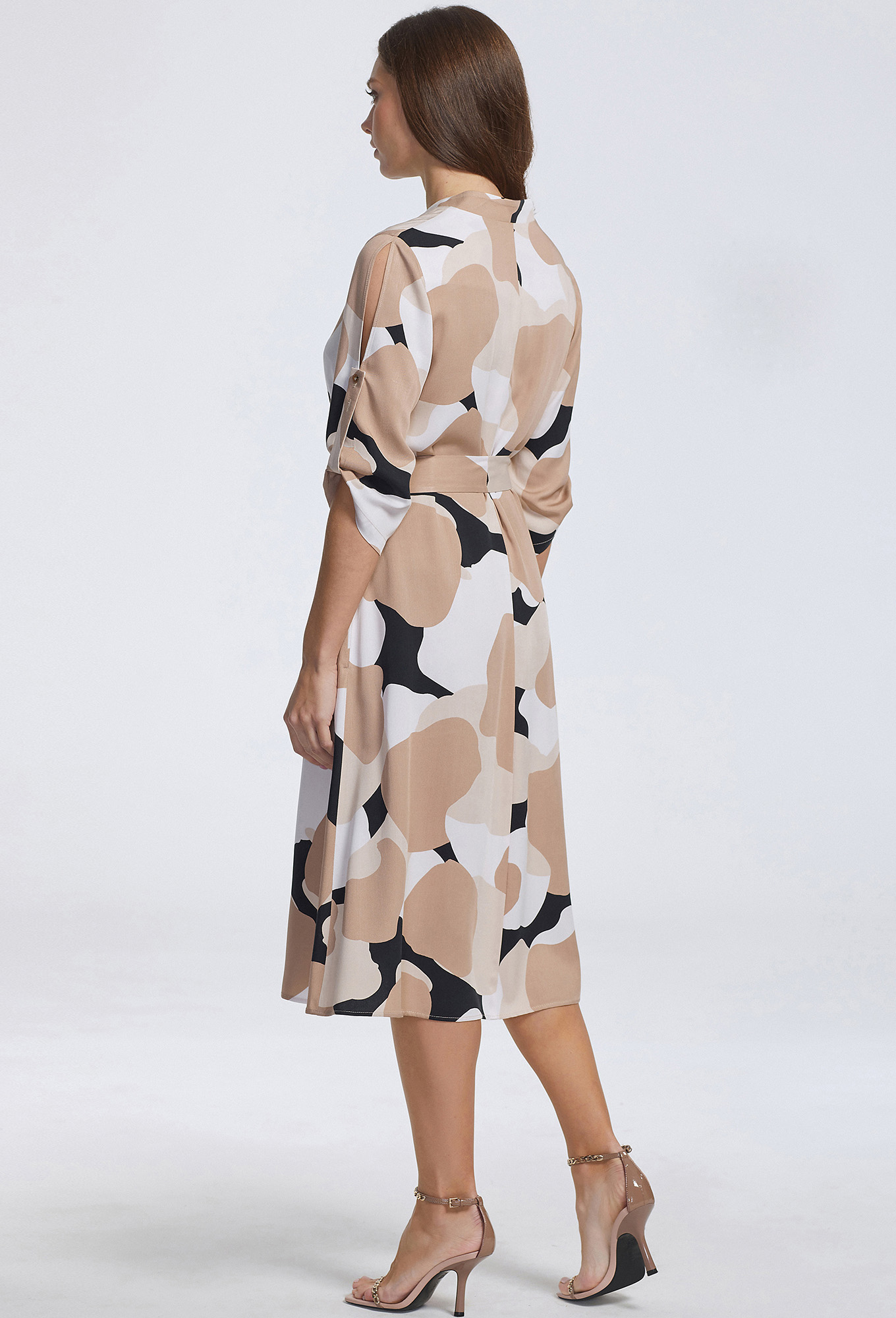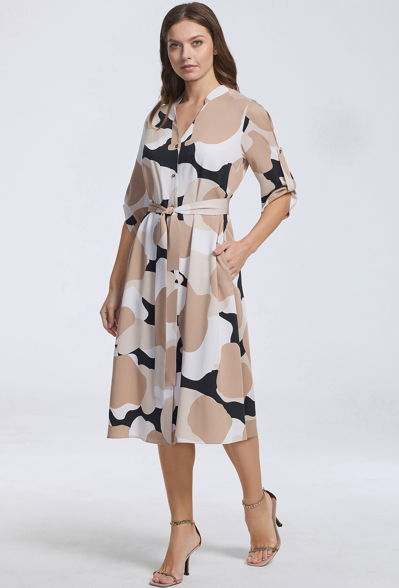 Модель: Базалини 4666 бежево-черный <..показатьli>Рост: 170 см (девушка на фото ростом 170см) Сезон: Весна-Лето Тип ткани: 100% ВискозаПлатье-рубашка А-образного силуэта – безупречное решение для создания элегантного образа. Модель сшита из мягкой, приятной к телу итальянской вискозной ткани с интересным дизайном. Модель с воротником-стойкой, с V-образным вырезом горловины, с застёжкой на петли и пуговицы и с функциональными карманами в боковых швах. Особое внимание заслуживают рукава со щелевидными разрезами и патами, образующими мягкие драпировки. Платье дополнено съёмным поясом-завязкой в тон, красиво подчёркивающим женскую талию.